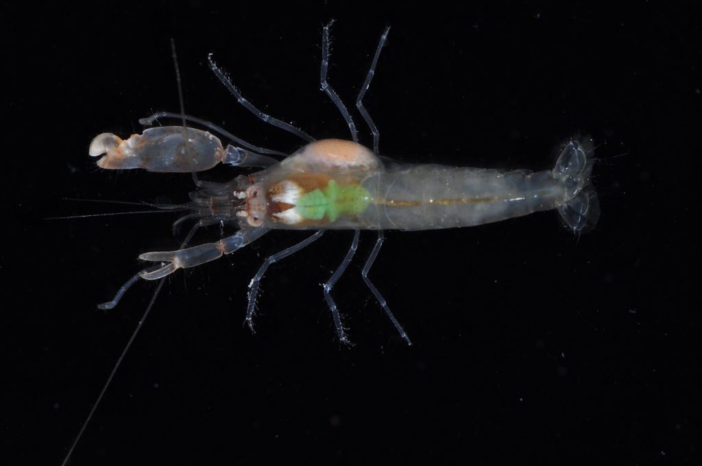 This shrimp has a noticeable bulge in the side of its carapace, which is an Asymmetrione (in the family Bopyridae). This is a parasite common to these type of shrimp, as well as crabs. In fact, crustacean fossils have been found with similar parasites, meaning this one-way relationship has been around for a long time.