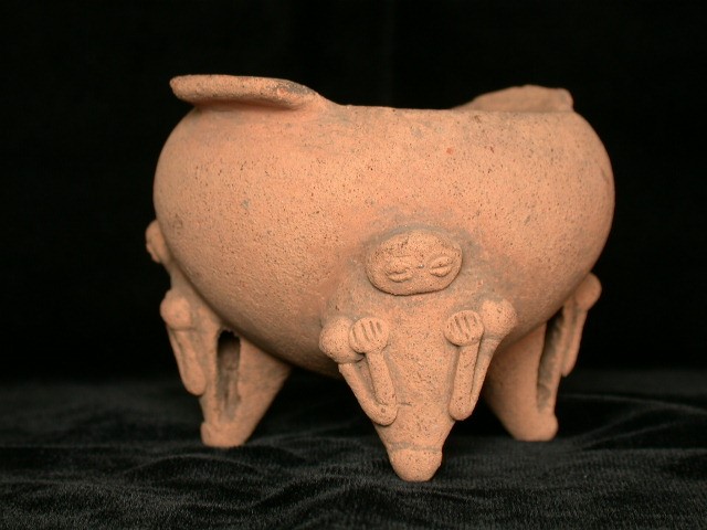 This tripod vessel is a salmon-colored ware that has a distinctive well-burnished slip, a type of ceramics less common than the unslipped Armadillo Ware (“Biscuit”) typical in the late period of the Greater Chiriqui, an area incorporating the Chiriqui province in Panama and southwestern Costa Rica.[1] The jaguar-head adorno on this vessel recalls jaguar imagery common in Greater Chiriqui graves, which contained metates (grinding stones) in the shape of jaguars, as well as gold pendants and a variety of late ceramic types.[2] Recent studies in the Diquis Delta have revealed that the Costa Rican Chiriqui-phase sites were most often located on broad terraces just above major water courses, suggesting a more intensive utilization of the major rivers during later times.[3]