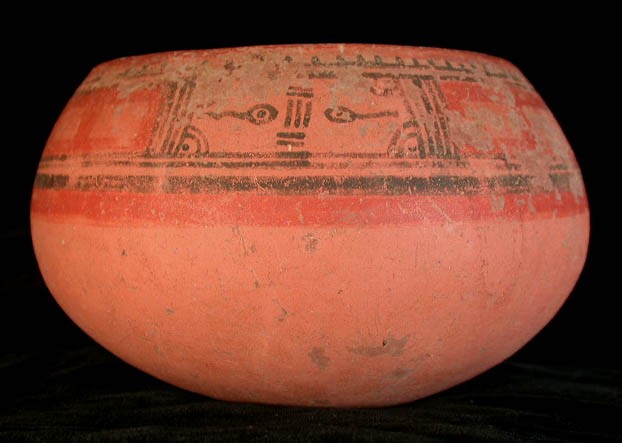 The use of fine line designs on this bowl is a defining feature of Luna Polychrome of the Late Polychrome period.[1] Like Vallejo Polychrome, ceramics of this type have a globular shape and the fine line decoration, but Luna Polychrome lacks the Mesoamerican motifs.[2] Designs are characterized by modeled or painted effigies of animals, human faces, and/or geometric motifs.[3] Luna Polychrome is found in the northern area of the Great Nicoya region of Costa Rica but the largest known concentration comes from the Ometepe Island Nicaragua, where some vessels have been found in mortuary contexts.[4] Notable changes in the Late Polychrome period are evident in a decline in the ceremonial activities with the cessation of mound construction and stone sculptures in the area.[5] Luna Polychrome has no local precedents and may reflect the arrival of new peoples or ideas, possibly from South American.[6] Suggestions of an Amazonian connection, however, have been rejected because Luna Polychrome lacks certain iconographic features and decorative techniques characteristic of Amazonian ceramics.[7]