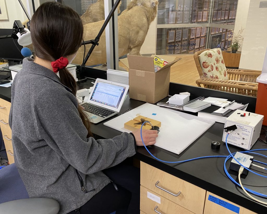 Abby and Jessica are evaluating just how perfectly these mimics resemble the model. To do this, they are collecting data on light reflected from certain areas of the wings by using a spectrophotometer. This instrument directs a beam of light at the subject and measures how much light of various wavelengths is reflected back. Specifically, they are taking measurements of light reflected from orange and blue patches of scales.