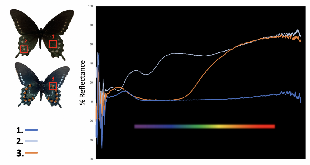 Birds and humans do not necessarily perceive color the same. In fact, birds can perceive colors beyond blue and purple, close to ultraviolet, which humans can’t see. So the spectral data collected from butterfly wings will be analyzed in conjunction with a model of bird vision. Abby and Jessica are collecting data from Pipevine Swallowtails and five species of potential mimics, including three other swallowtails (family Papilionidae) and two brush-footed butterflies (family Nymphalidae). These mimics include the Spicebush Swallowtail (Papilio troilus), the Eastern Black Swallowtail (Papilio polyxenes), the dark form of the Eastern Tiger Swallowtail females (Papilio glaucus), the Red-spotted Purple (Limenitis arthemis astyanax) and females of the Diana Fritillary (Speyeria diana).