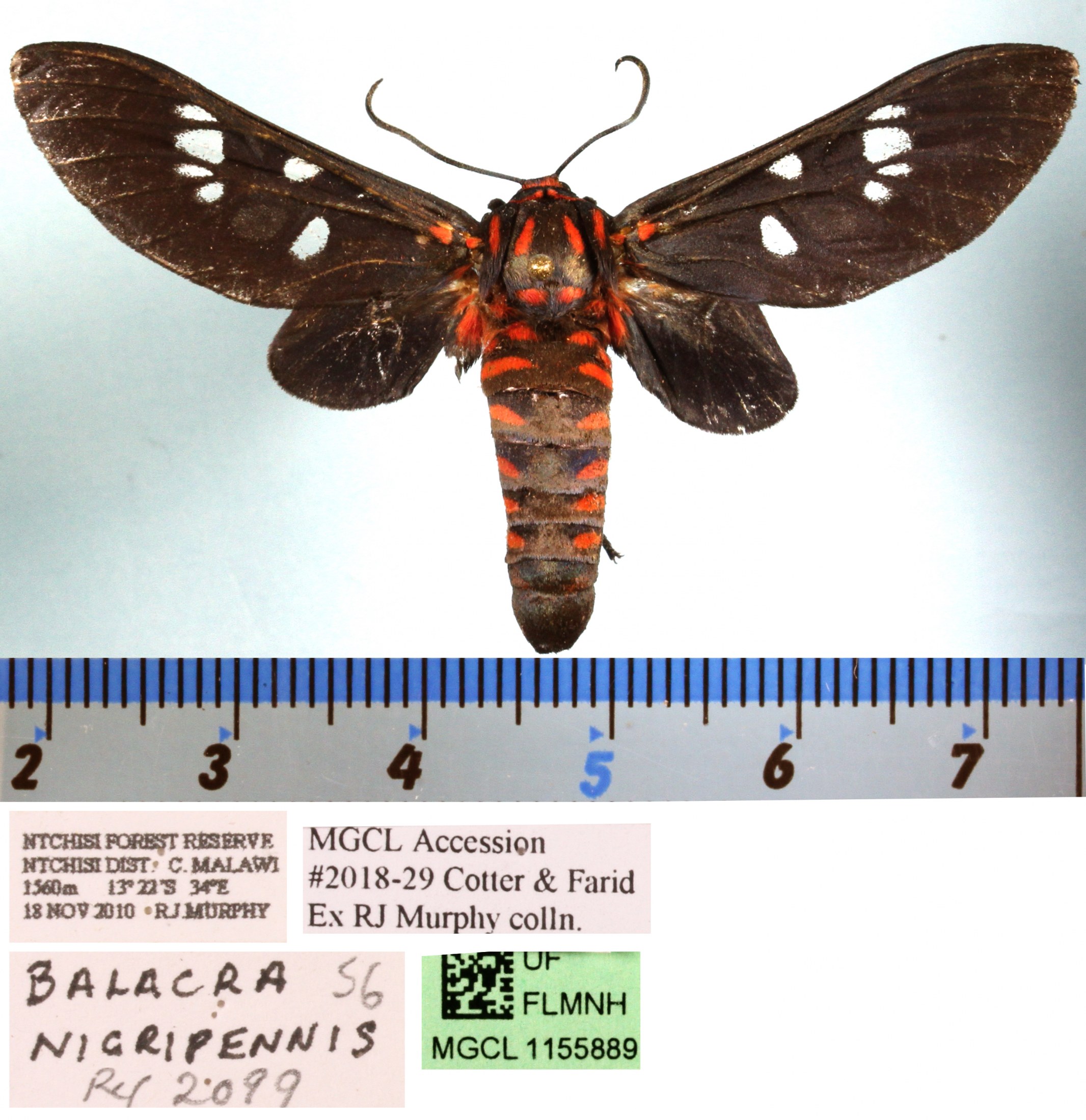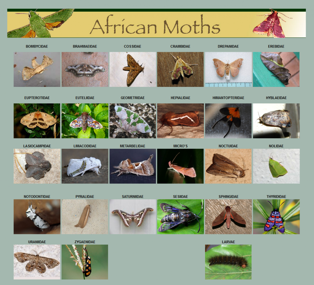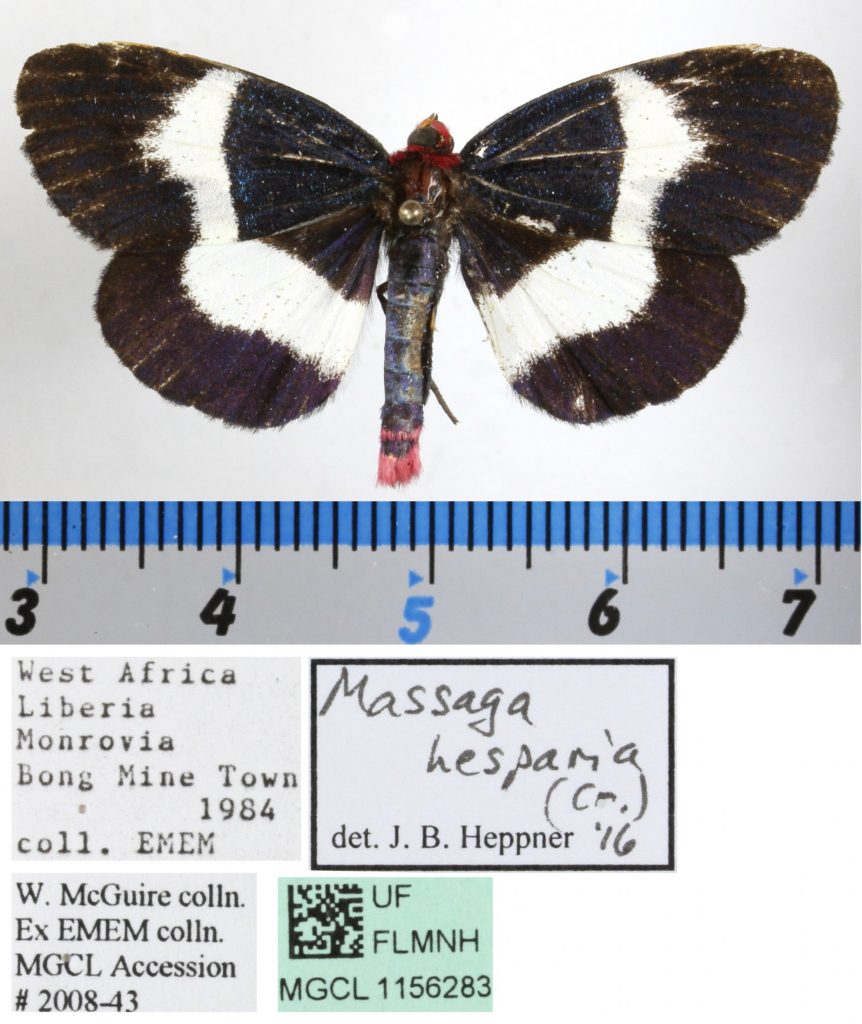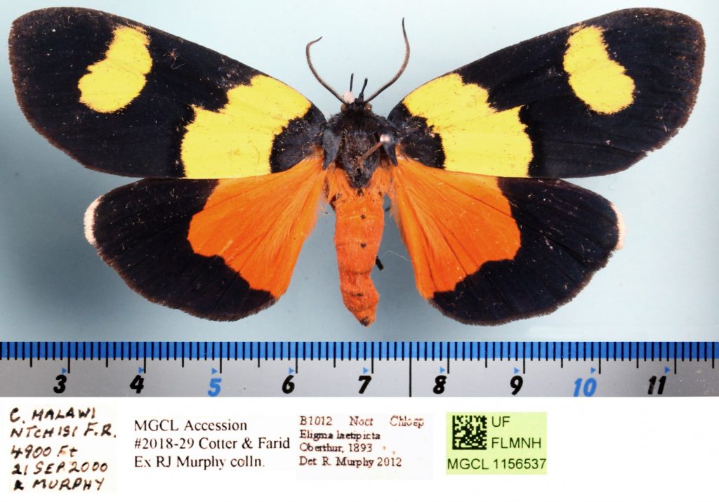 Roy Goff traveled from his home base in England to photograph several hundred species of Sub-Saharan African moths in our collection to add to his growing website, African Moths. This image-based website features more than 4,500 species. Since books and other printed reference materials are not readily available to local researchers in Africa, internet resources are especially important for identifications. While at the McGuire Center and with additional grant support from the Center for Systematic Entomology, Roy focused on imaging expertly identified specimens of species not already represented on the website or anywhere else on the internet. With images of the accompanying labels on each specimen, his work documented hundreds of new country records. Since the launch of African Moths in 2007, more people have become interested in monitoring moth diversity on the continent with the help of this valuable tool. Some examples of African moths from the McGuire Center collection are shown in the gallery below including several specimens from the Republic of Malawi collected by Ray Murphy.