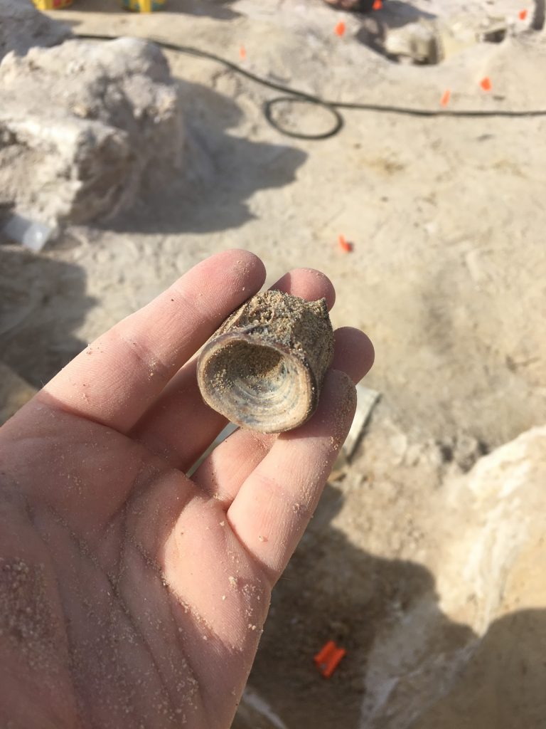 “Another unique thing about today’s dig was learning about bagging “the matrix.” This ultimately means saving the gravel-like sediment from your square in a specific bag, rather than just discarding the sediment that surrounds the fossils to a large hill located a few meters from our large hole in the ground. For me, it was still a learning day, but nonetheless very interesting. I am still working on my ability to distinguish meaningful bones from useless rocks, while figuring out the most efficient speed to dig. Some of my favorite finds that can be seen in the photos are a tiny shark’s tooth (about a centimeter wide), an alligator’s tooth (go Gators!), and a fish vertebra!” – Blake Meyer