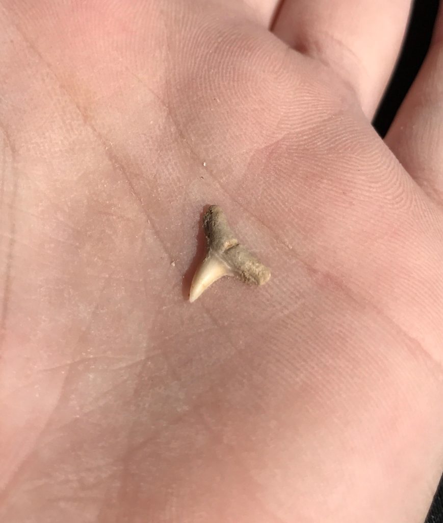 “In this layer, we kept the dirt we were digging through and put it into bags that would be taken back, rinsed and looked through more carefully. At the last dig, it was mostly soft sand with little chunks of clay but this dirt was coarser and seemed to be small fragments of fossils that had collected in this layer through a stream. The most exciting discovery of the day was my shark tooth I found near the end of the day. It had serrations and was bright white in color. I’ve found shark teeth before on Venice Beach and they were dark in color, but finding a shark tooth in the middle of Northern Florida surrounded by pine trees and beef cattle really makes me wish I knew what that area had looked like 5 million years ago. A little later on I found another shark’s tooth which I suspect was from a different species because it was smaller and rounder, angled to the side, and lacked serrations.” – Storm Wittenberg