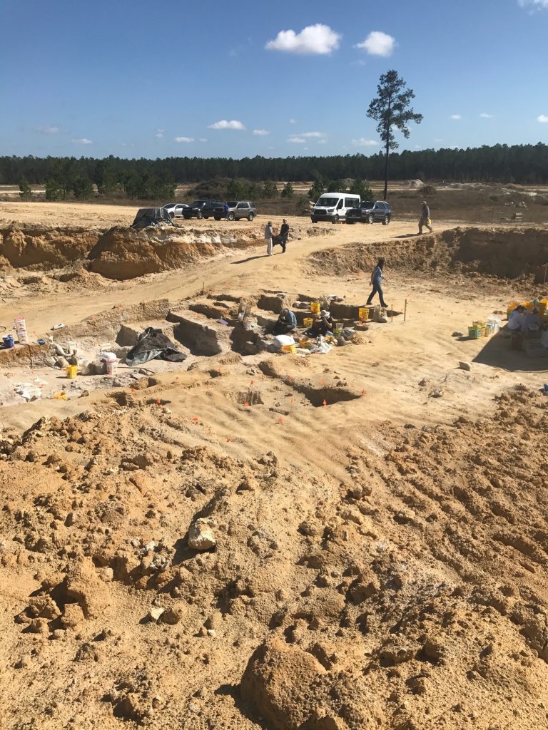 “I arrived to some volunteers already in the pit working and Dr. Richard Hulbert happy to give me some background. He explained this site’s main purpose, mining ancient windblown dunes of pure, white sand. Our interest is below that layer according to him, and looking into the pit it is quite apparent. Large bones are partially exposed in the middle of the pit in the deeper areas. Around that largest bone group, volunteers work in 1×1 meter squares.
