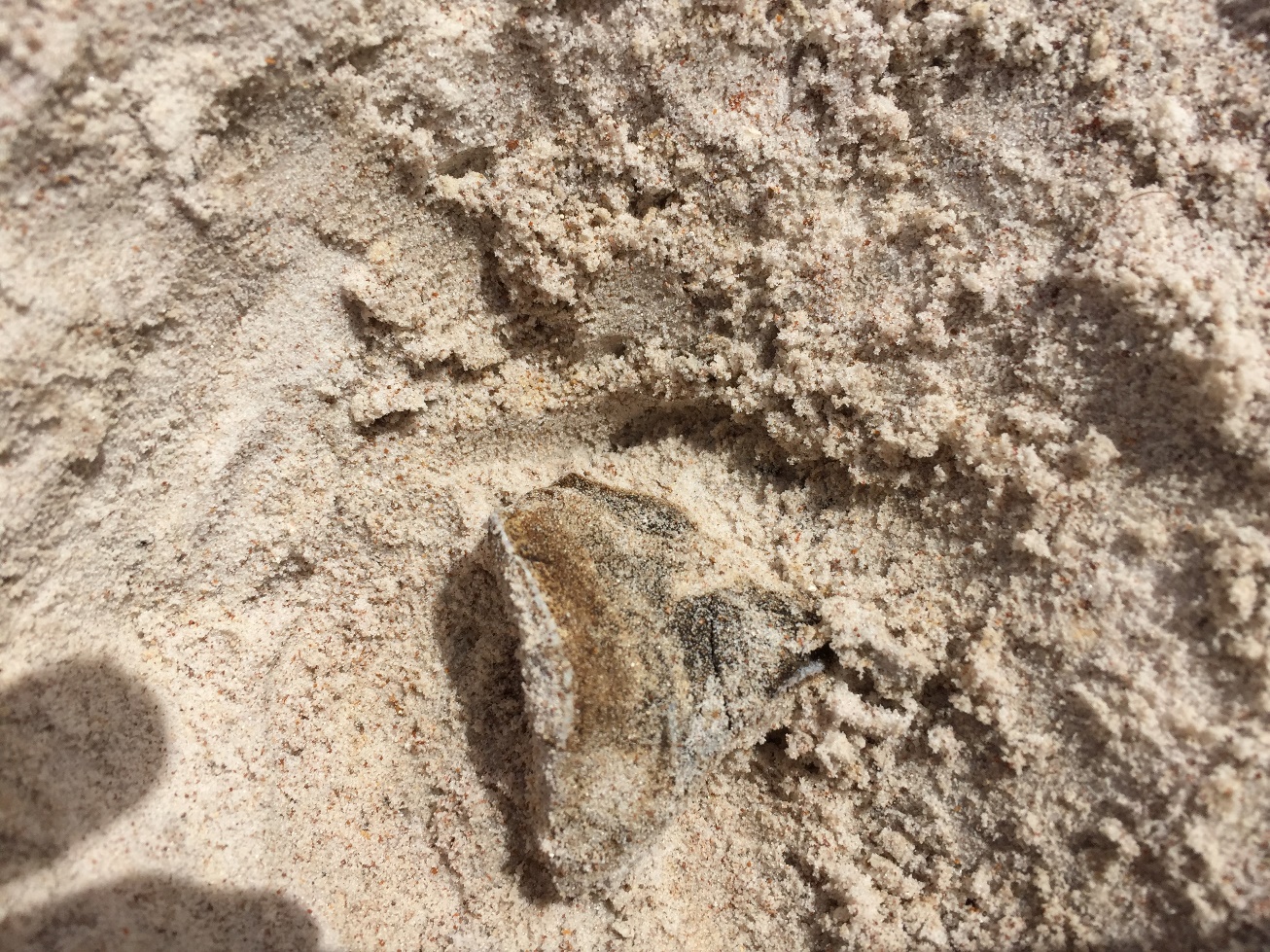 “I didn’t really know what exactly to expect for my first paleontology fossil dig. The one thing I knew for certain though, was that I really wanted to find a shark tooth. After getting to the site and given some instruction it was time to start digging. The first thing I pull out of the ground thinking it might have been a fossil turned out to be a small rock. The next thing I pull out thinking it might have been fossil turned out to be… a different type of rock. Everyone around me though seemed to be finding really awesome stuff so I continued searching for that shark tooth. After that I didn’t seem to find much of anything for a couple hours. Then Richard, a paleontologist, asked me to help him make a plaster casing of this massive elephant vertebrae in order to remove it from the site without damaging it. I wasn’t going into this completely blind as I saw someone else make one earlier so I jumped right in. Once finished, me and Richard were basically covered in plaster but the experience was definitely worth it. After cleaning up a bit I got back to digging in a different area of the site. Within seemingly a few minutes I had finally found this really awesome shark tooth. This made every second of digging worthwhile. I had dug up my first fossil. After a couple more hours of seemingly finding one fossil after another it was time to clean up and go. It took some time for me to find my fossil but the whole experience was definitely a wonderful time. I am really excited for my next dig.” – Justin Farley