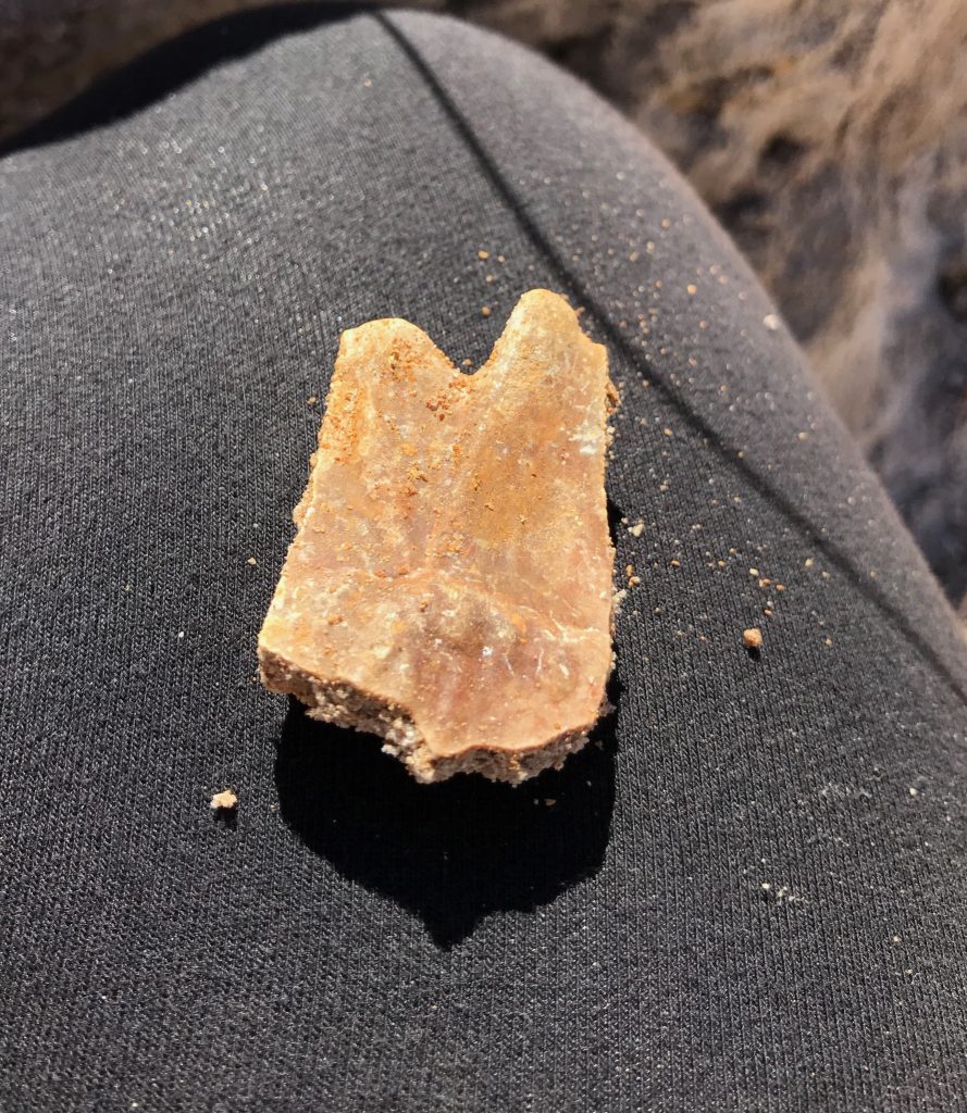 “Today was my fourth dig day. The weather was beautiful before lunchtime and then grew very hot after. As always, the site was peaceful and near silent other than small chatter and tools digging. Overall, I feel as though I found less fossils than my other days, but they were more notable finds. My morning started with several tiny fish bones. Fish bones are a pain because you will almost always break them unless you dig at a snail’s pace. Not to mention I hate the feeling of, “oops, I think I just broke that.” Eventually, I pulled up a larger sized fish bone, followed by a very cool alligator tail vertebra. To date, the tail vertebra is probably my favorite find. Hours went by and I found no other fossils. My square was quickly turning into just a sand pit. My square was actually so uneventful, that it became the location to provide sand for other people’s plaster jackets. Nonetheless, I didn’t mind carrying several buckets worth of sand away from my dig location. I enjoy using the time to zone out to music or catch up on some podcasts. As the day went on, I started to find a few more fossils including a turtle shell fragment (of course), an alligator claw, and a snapping turtle toe. Overall, I thoroughly enjoyed my finds for the day even if there were just a handful. As Dr. Bloch and Dr. Hulbert always say, someone will reap the benefits of your hard work on a later day, and with that being said, I am okay with my time being spent for the greater good of the site.” – Blake Meyer
