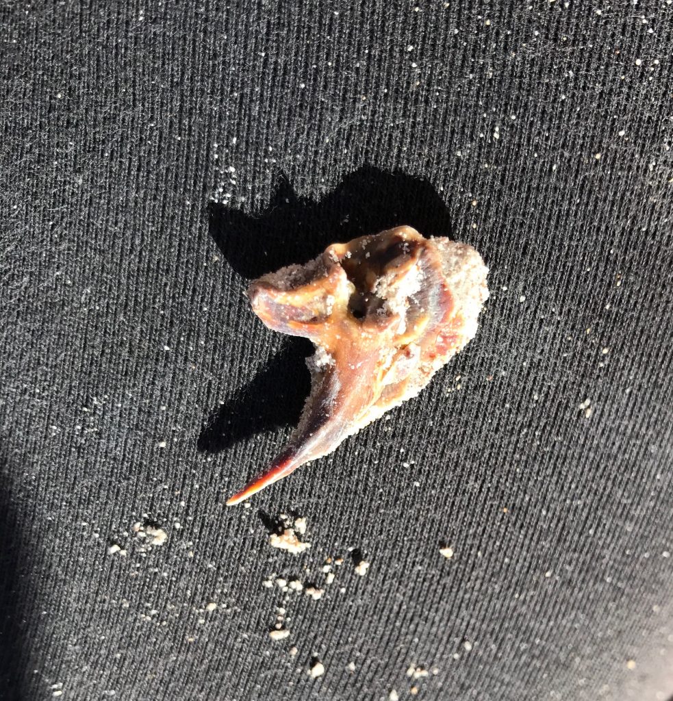“Today was my second half-day at the dig site. I again forgot sunscreen 🙁 but had a very successful day at the site. I found a snapping turtle vertebra, lots of pieces of turtle shell, a tooth, and multiple claws. The past two times I have gone to the site I have been in areas with more rock and hard clay. These areas require more detailed digging and multiple allocations of water. As much as I enjoy finding more fossils in these new plots, the areas with looser sand were easier to dig in and allowed for a lot more filled buckets. Being in this area made me feel more accomplished afterwards because I could see improvements and changes much faster. I also found myself making less mistakes and I was able to take better care of the bones I found because of the looser surroundings. I didn’t take any pictures today but my next time at the site will be a full day and I will be sure to take some then!” – Monica Sciturro