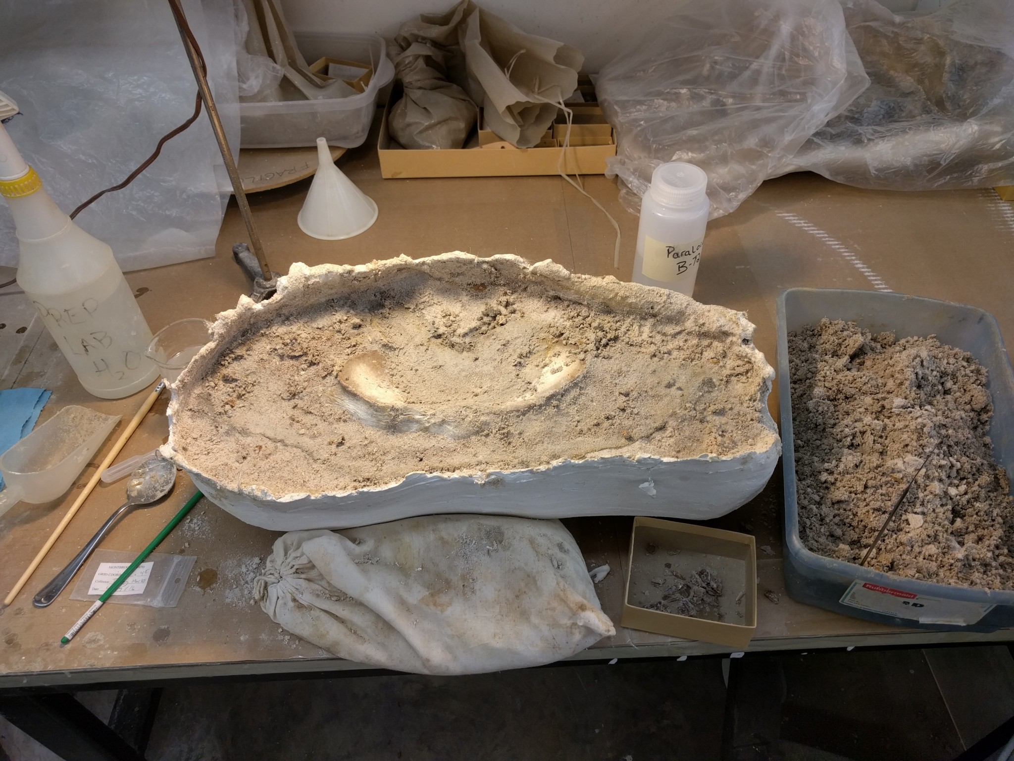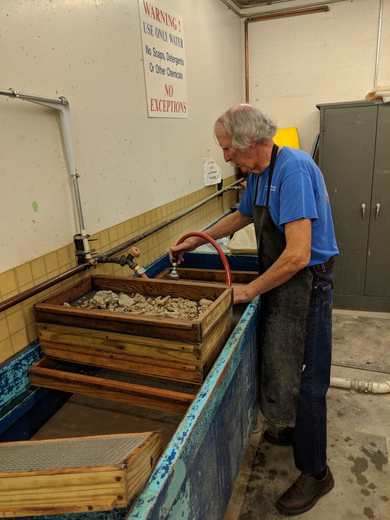 If you are interested in what happens to the fossils once they are brought back to the lab, or just prefer to work indoors, you can volunteer in the vertebrate paleontology collection here on UF campus or at our off-campus warehouse in Gainesville. Volunteers prepare specimens out of plaster jackets, screen wash, glue bone fragments back together, pick microfossils, or help with the cataloging process. To learn more about volunteering in the lab or warehouse: