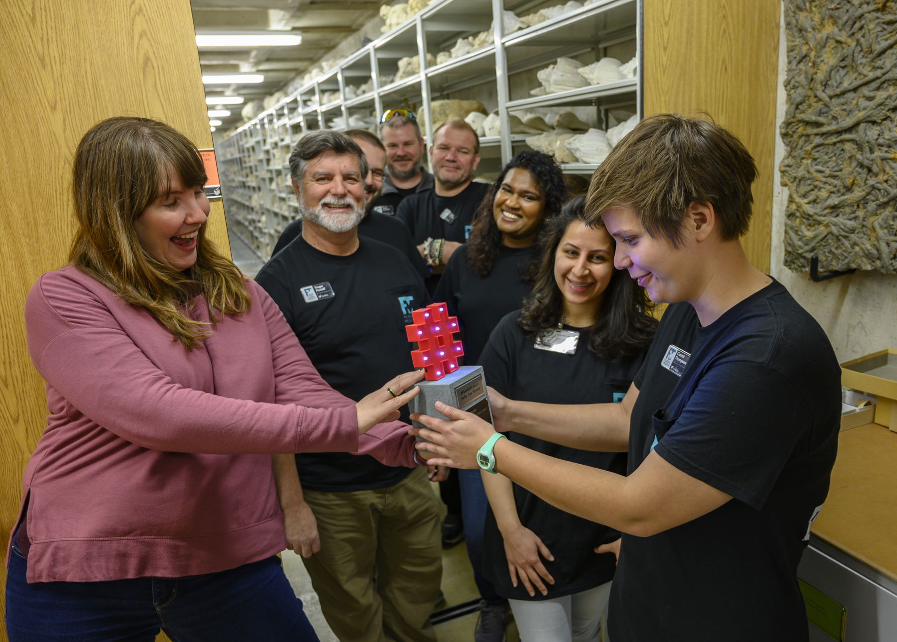 For 2018, the Hashtag Award was held by our herpetology collection, and it was ceremoniously passed on to the 2019 winners this week. Like the Stanley Cup, each year’s winners are engraved on the award base and that team displays the award in their work space. And yes, the hashtag does light up!