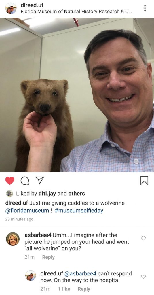 Without further rambling, the 2020 Museum Selfie Day winner is the Bloch Lab in the vertebrate paleontology collection! Not only did they show up and show off, they did a great job sharing some knowledge with us all.