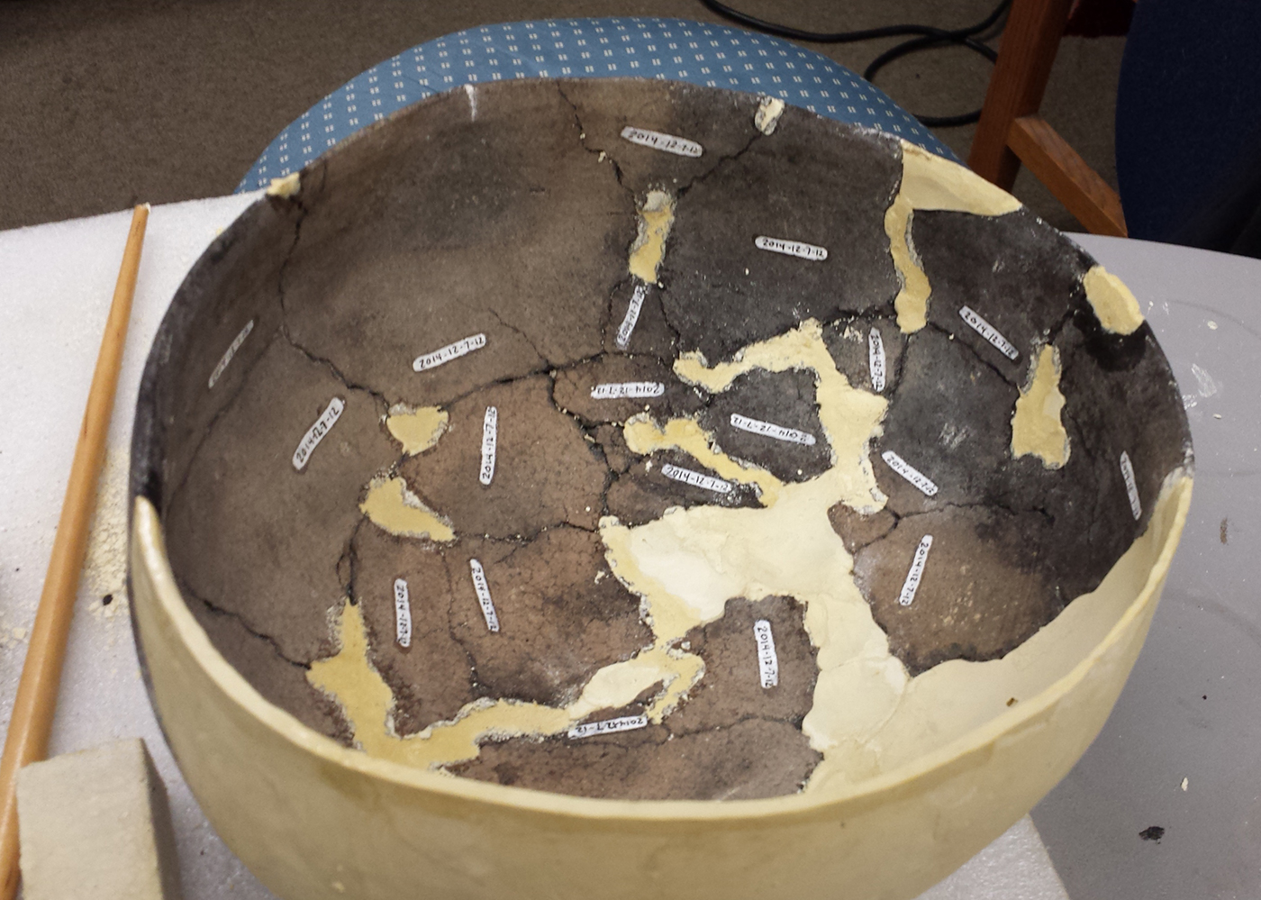 Today we found Ann Cordell in the ceramics lab reconstructing a ceramic vessel from approximately 1000 B.C. to 500 B.C. From the dark areas, which are numbered artifacts, she extrapolates the rest of the vessel based on her vast experience with the type of pottery and origin.