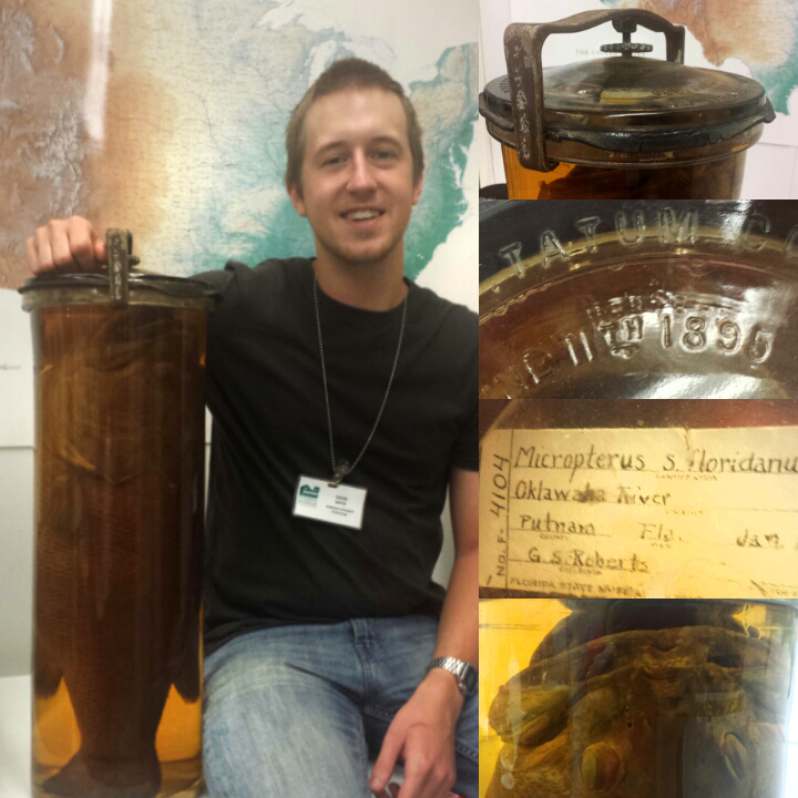 Curation assistant, David Boyd, shows off one of his favorite ichthyology specimens. It’s a visitor favorite as well because it’s visual impressive by size and age. Florida Museum photo by Radha Krueger