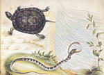 Spotted Turtle (Clemmys guttata), and Corn Snake (Elaphe guttata), drawn in watercolor by William Bartram on one sheet to save paper, shows the naturalist’s strengths and weaknesses as an artist. The “Wampon Snake” is swallowing a smaller snake.