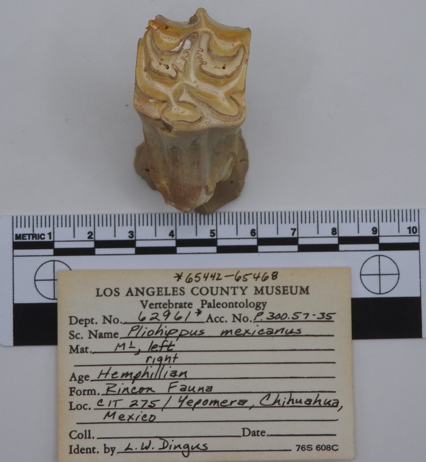 The trip started with a week-long visit to the Los Angeles County Museum of Natural History (LACM) where she photographed the upper and lower molars of Dinohippus mexicanus. The LACM houses one of the largest Dinohippus mexicanus collections from the type locality (the location where this species was first identified) Yepómera in Chihuahua, Mexico. A total of 263 individual teeth were photographed in both their lateral (side) and occlusal (chewing surface) views.