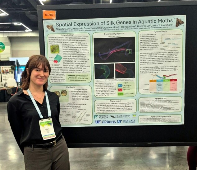 Traveling to Portland with my fellow lab members was an exciting opportunity to deepen my understanding of our collective silk research and other interesting Lepidoptera projects. Presenting my preliminary data on the spatial expression of silk genes in two aquatic moth species was the highlight of my trip. I was honored to receive first place in the systematics, evolution, and biodiversity section of the undergraduate poster competition. This achievement has generated confidence in myself as an emerging researcher and affirmed the direction of my academic efforts. More importantly, the poster session opened the door to meaningful conversations with students and researchers working in SysEB and adjacent fields.