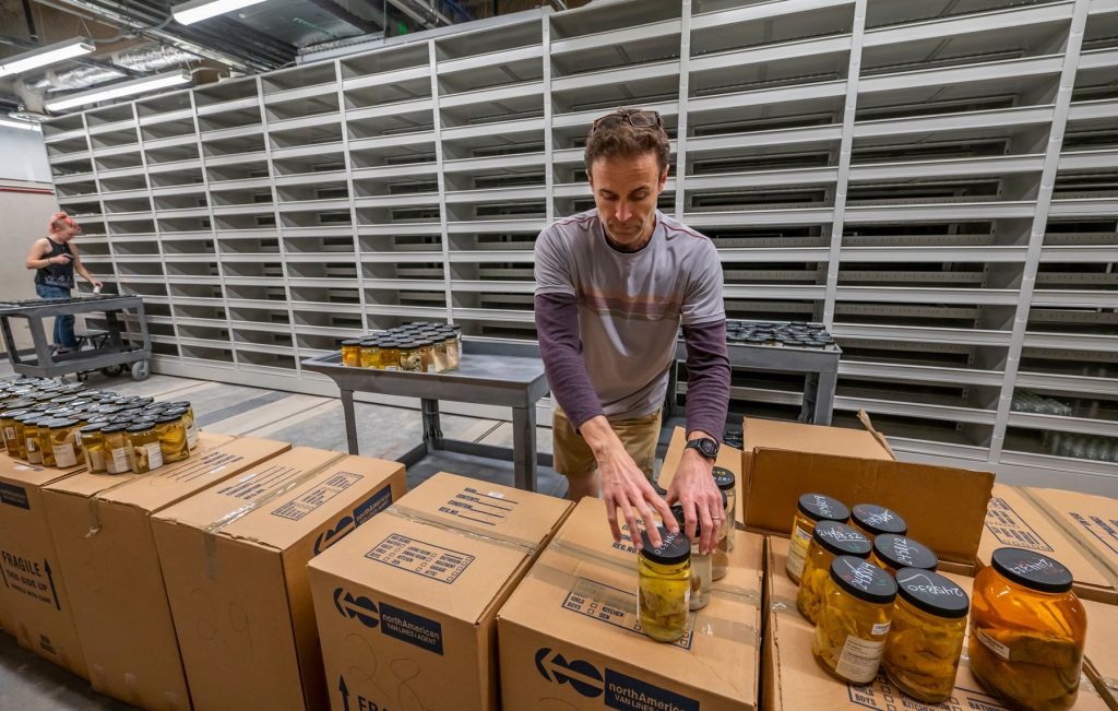 Invertebrate Zoology curator Gustav Paulay loads a tray of specimens onto shelves.