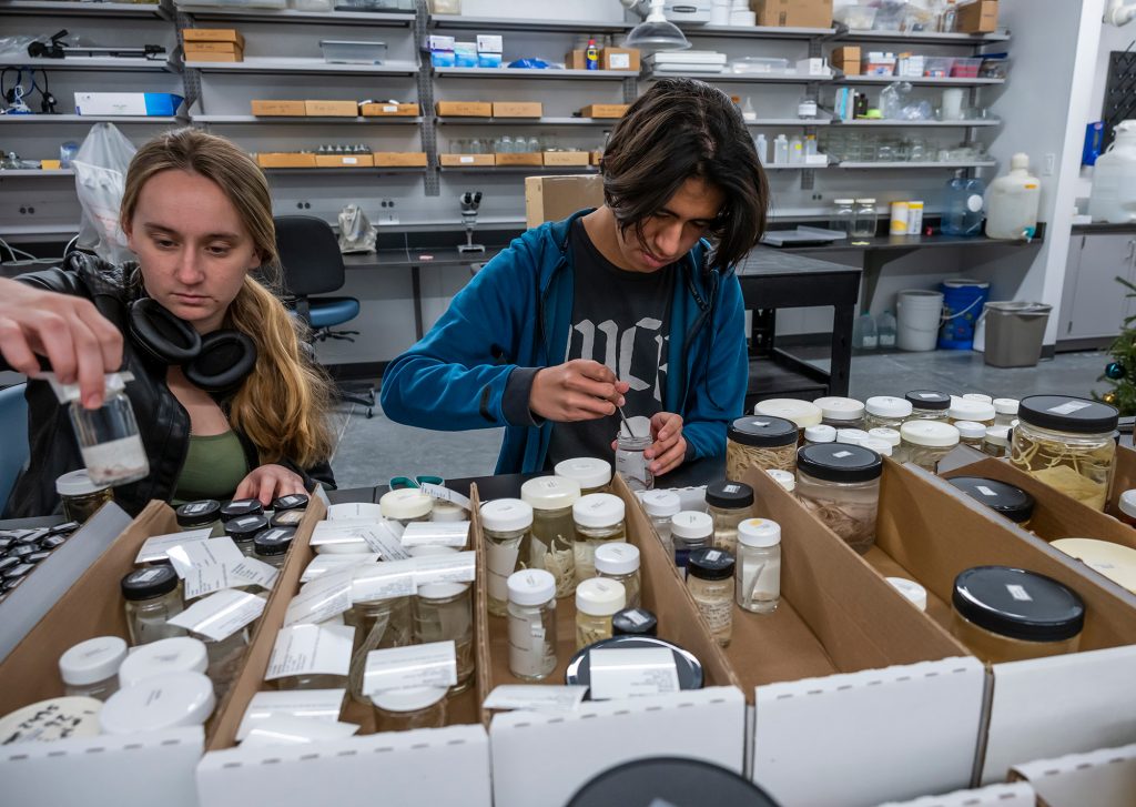 Students Zoey Zacharias and Emilio Pedroza-Lopez work with specimens used for grant-funded research projects in Invertebrate Zoology.
