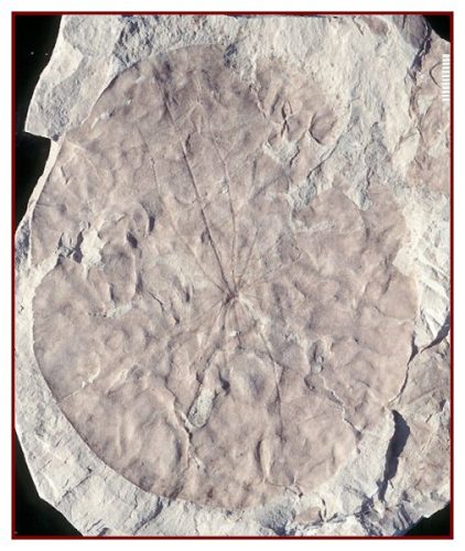 Brasenites kansense Wang and Dilcher, an aquatic angiosperm leaf from the Hoisington III locality, Kansas. UF15706-14806. Note suborbiculate leaf shape, entire leaf margin, peltate central base, and major primary veins. Scale bar = 1 cm. Figure 7d, Wang and Dilcher 2006.