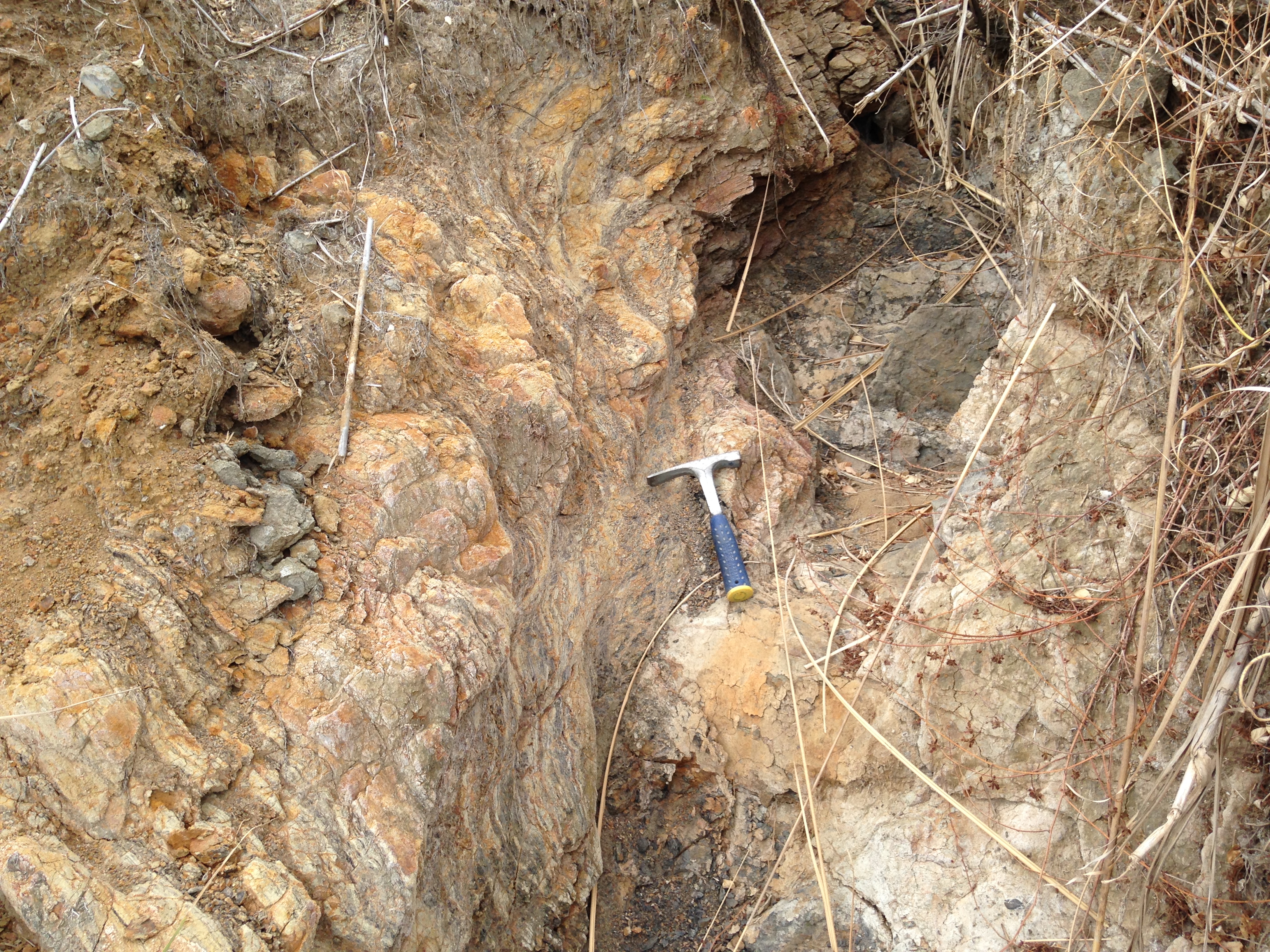 We measured the dip–the angle at which these sedimentary layers are tilted–then used a Jacob’s staff to determine the actual thickness of the beds as we walked in a straight line up the section. I had never used a Jacob’s staff before but the others gave a great lesson and it turned out to be a lot of fun! We described the rock as best we could, arguing over the coarseness of a sandstone or whether the bedding could be called ‘lenticular’, and came up with some hypotheses. There are some tuff (volcanic ash) units, which we think might correspond with the upper Las Cascadas Formation, topographically above some calcareous sandstone containing oysters and other shells that reminds us strongly of other Culebra Formation outcrops. Because Las Cascadas is stratigraphically below Culebra, this would mean that the section is overturned, at least along the line we were walking. We remain puzzled by a hard, blue rock that cuts across the tuff, and we’re working on getting ahold of a higher resolution GPS so we can start to map the area. We’ll definitely be going back to try to pull a straight story from a very tangled rock.