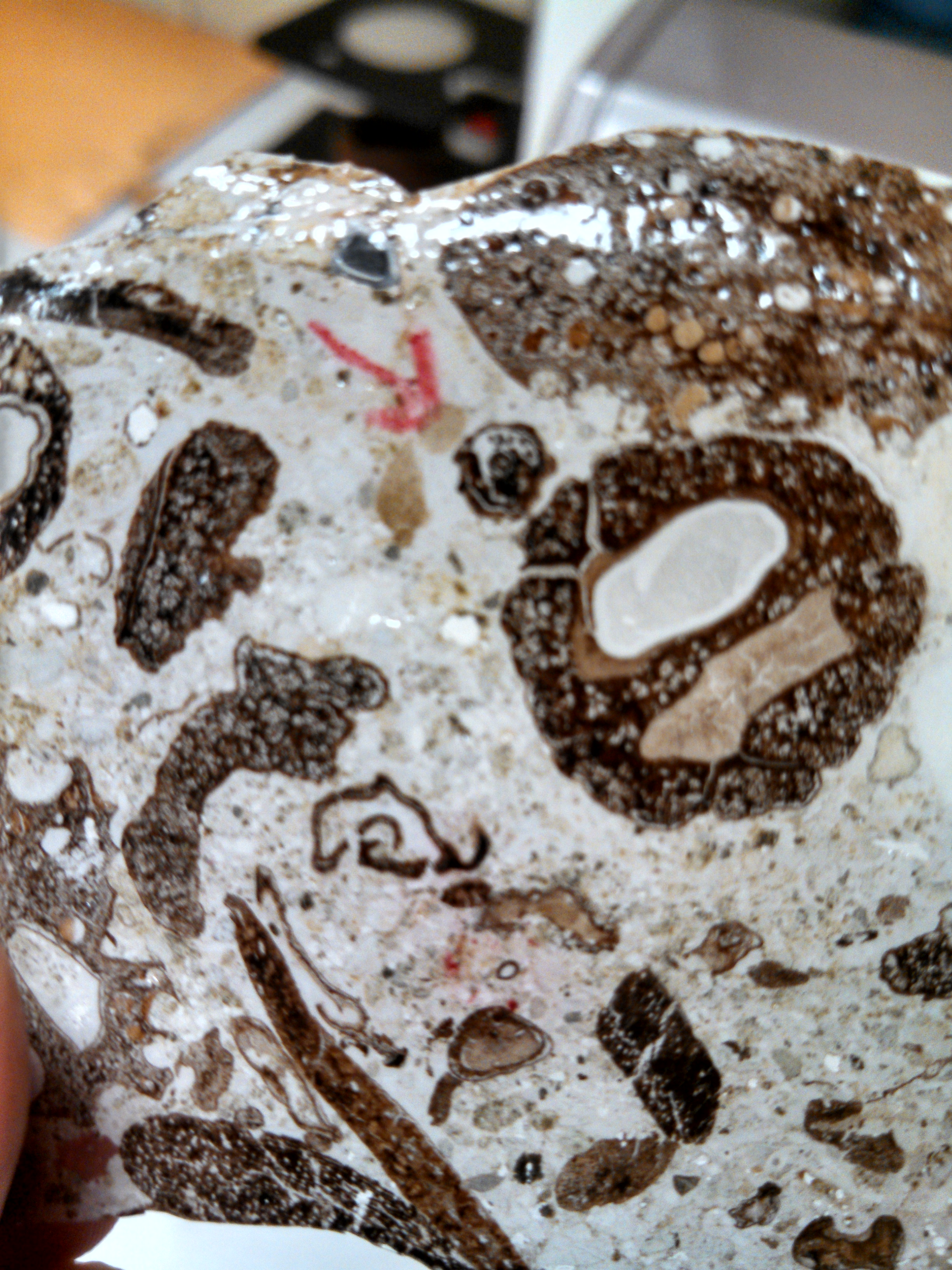 The technique I’ve been learning are ways to prepare the fossils for research. In the paleobotany lab, I helped Nathan, the resident paleobotany expert and post-doc, to create acetate peels of the cross-sections of calcitic mudstone chock full of fossilized plant material. As you can see, the peel below shows a cross-section of a Parinari fruit pit, similar to a peach pit, as well as several other sections of fossilized wood and seeds.