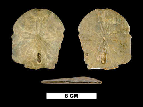 For this last Friday of February we have a fossil echinoid, Encope sp. Echinoids (Class Echinoidea) belong to the Phylum Echinodermata, which includes starfish, sand dollars, and sea lilies. Echinoids have a skeleton made up of tightly interlocking plates called a test and fall into two categories: regular and irregular. This echinoid is an irregular echinoid because it is bilaterally symmetrical instead of radially symmetrical. You can tell because you can “fold” one side of the specimen over the other along the axis of symmetry and both sides look identical. Irregular echinoids burrow into the surface of the sediment to collect food.