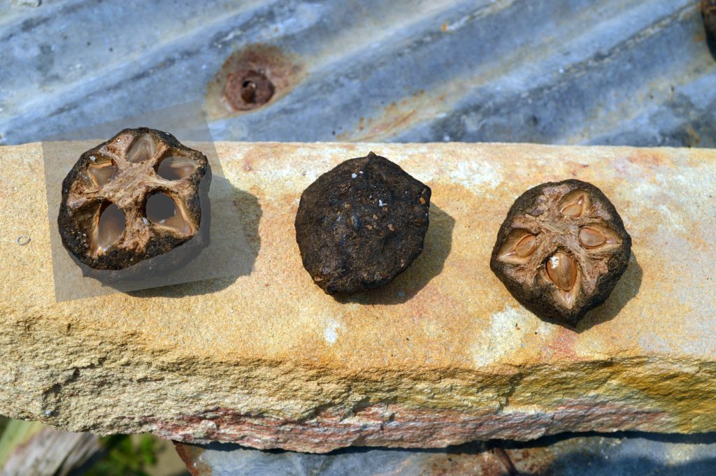 Dracontomelon trees are large rainforest trees, and according to the Plant List there are 9 species. The fruits are greenish and are used to make candy and in Asia, the brownish colored pit of the fruit is sometimes called “human-face” because of the shape of the valves where the germinating seeds burst through the pit. The pit is what is preserved here as a fossil. It is thick-walled and contains five seeds and five air-spaces, seen in cross section above. Below is a photo from Flickr of the pits of a modern species.