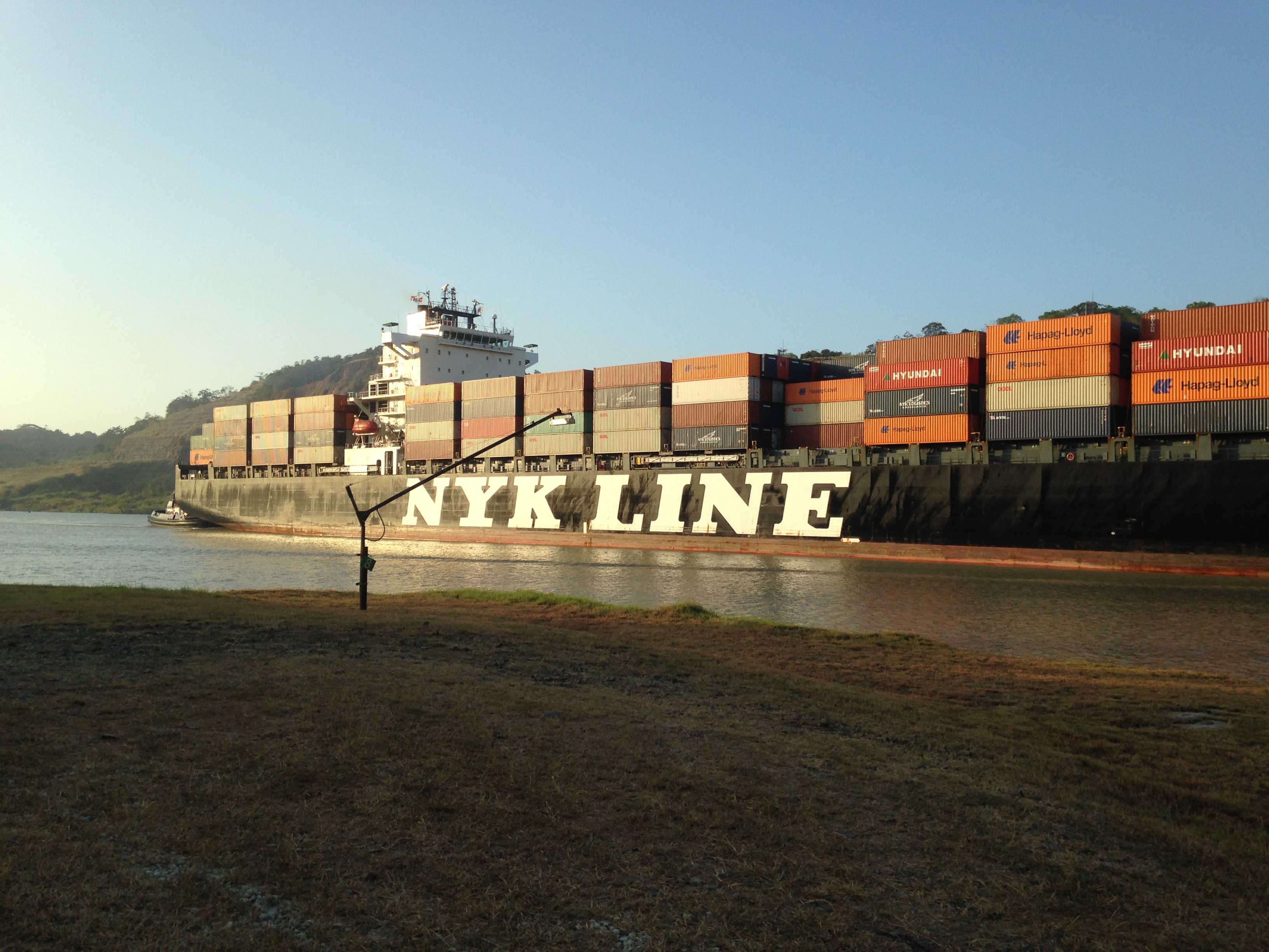 My name is Sophie Westacott and I’m one of four field interns currently digging up fossils here at the Panama Canal for PCP-PIRE. My fellow interns are Adam Bouché, Sonia Sanchez and Jeremy Dunham, and together we make up the sixth “cohort” (as they like to call the groups of seasonal interns here). Our supervisor is Jorge Moreno of Bogotá, who received his master’s from University of Nebraska, Lincoln and specializes in crocodilians. We’re here until May 1st so you’ll be seeing more from us! Here is a photo taken at the canal today. This ship passed by while we were looking for fossil crabs.