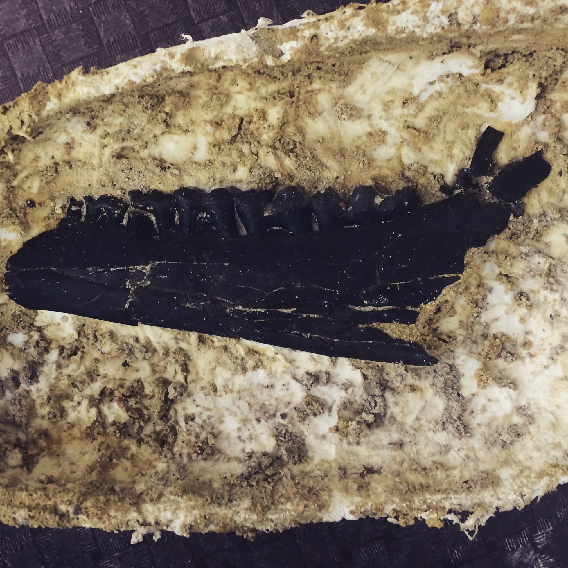 Once at the site, we were given an introduction by Dr. Richard Hulbert. He told us that it used to be a large sinkhole, with some limestone caves. We talked about the sediment we would encounter and the types of fossils we would be finding. At Thomas Farm, they dig in 10 cm intervals, using a grid system to denote different squares. This is similar to how archaeological digs are done. Much of my fieldwork training comes from archaeological work, so I was very familiar with this and felt very comfortable digging this way. Various fossils were uncovered, and I even got to make my first jacket, which was for a mandible belonging to the camel Nothokemas.