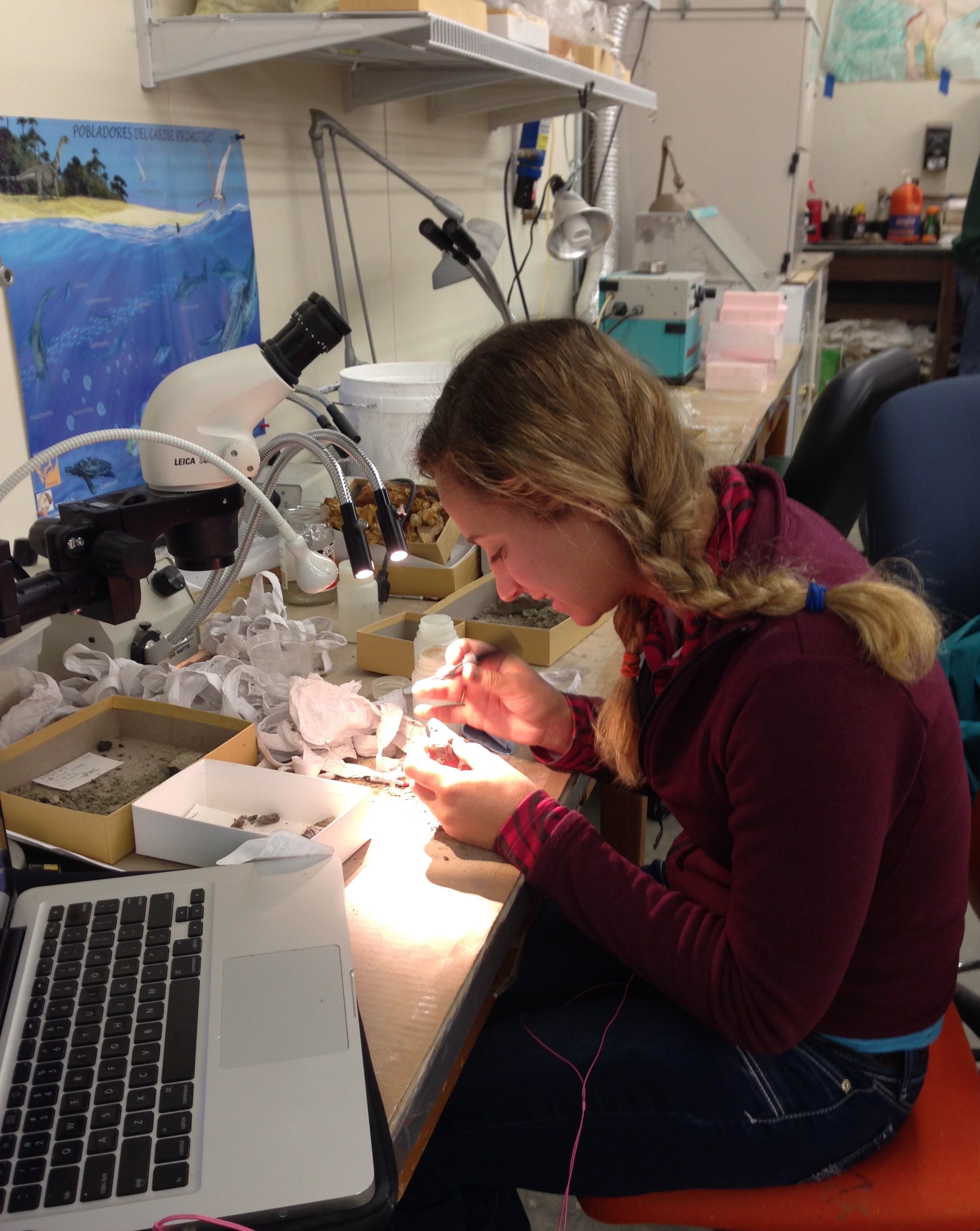 The interns have started off by helping prepare a lumbar vertebra of a fossil rhinoceros from the Cucaracha Formation. The vertebra has been broken into several pieces and the interns are cleaning the pieces so that they can be put back together later.