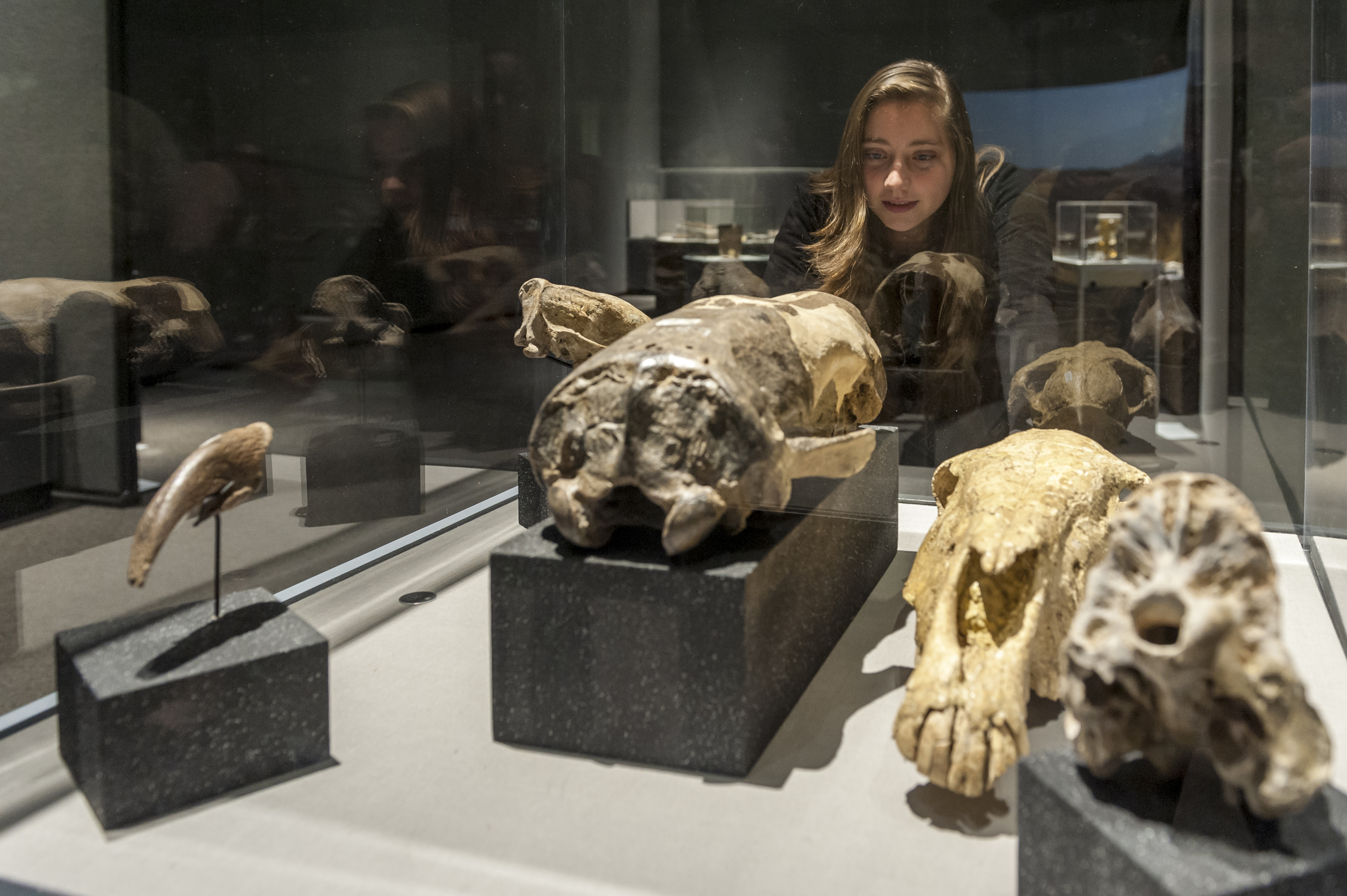 Visitors view rhinos and other fossils displayed in the Florida Museum of Natural History’s “Rare, Beautiful and Fascinating” 100th anniversary exhibit, on display Sept. 23, 2017-Jan. 7, 2018, in Gainesville. ©Florida Museum photo by Kristen Grace