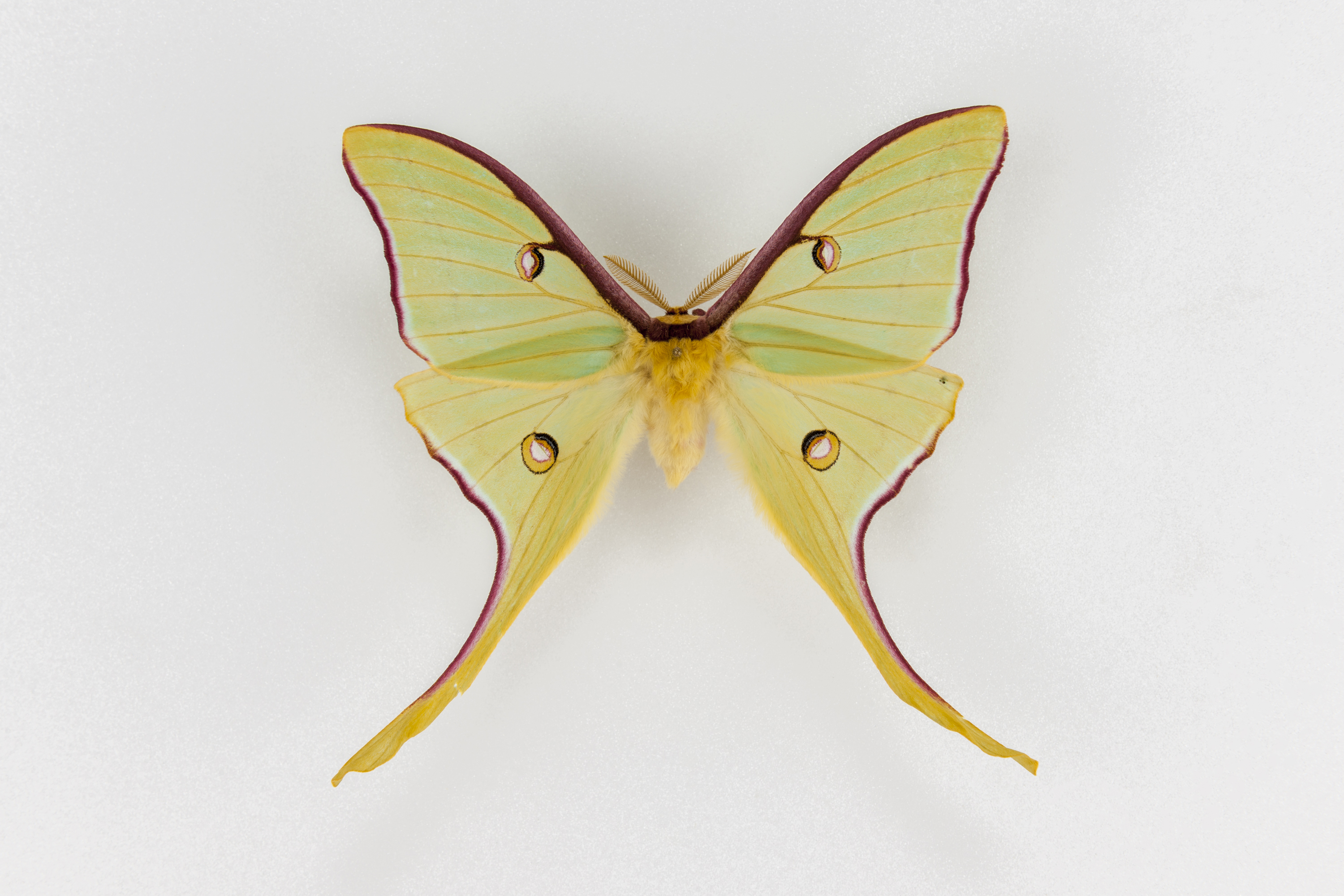 The luna moth evolved a long tail that it spins to ward off bat attacks. It is one of more than 100 objects featured in the Florida Museum of Natural History’s “Rare, Beautiful and Fascinating” 100th anniversary exhibit, on display Sept. 23, 2017-Jan. 7, 2018. ©Florida Museum photo by Kristen Grace