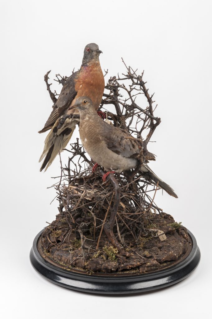 Once among the most abundant birds in the world, the last surviving passenger pigeon died in captivity in 1914. These mounted specimens are featured in the Florida Museum of Natural History’s “Rare, Beautiful and Fascinating” 100th anniversary exhibit, on display Sept. 23, 2017-Jan. 7, 2018. ©Florida Museum photo by Kristen Grace