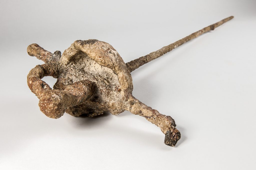 X-rays of a piece of coral recovered from a 17th or 18th century Spanish shipwreck revealed a hollow space that once contained a metal sword. This cast, made by pumping resin into the hollow space, is featured in the Florida Museum of Natural History’s “Rare, Beautiful and Fascinating” 100th anniversary exhibit, on display Sept. 23, 2017-Jan. 7, 2018. ©Florida Museum photo by Kristen Grace