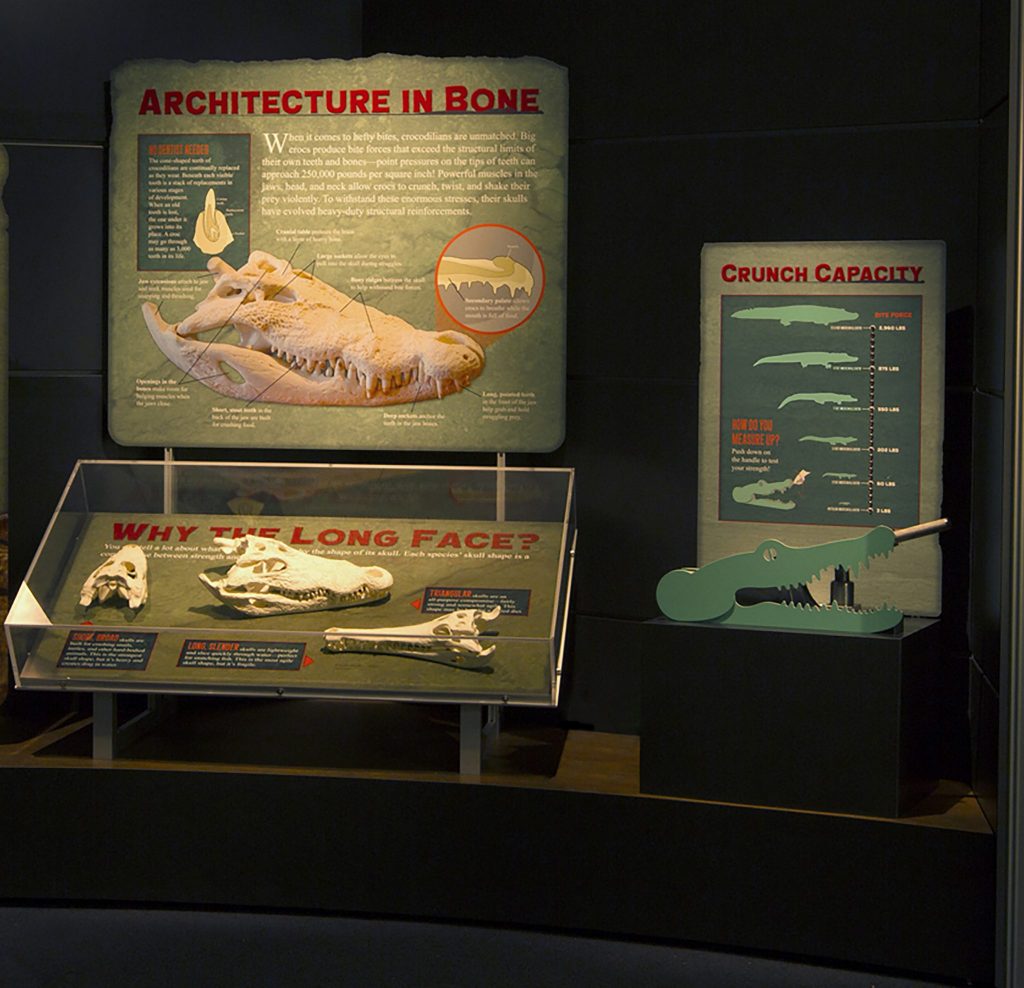 Informational panels and videos of paleontologists, crocodilian experts and conservation biologists educate visitors on the physiology of these reptiles in the “Crocs: Ancient Predators in a Modern World” exhibit, on display at the Florida Museum of Natural History in Gainesville May 18, 2019-Jan. 5, 2020. ©Photo courtesy of Peeling Productions