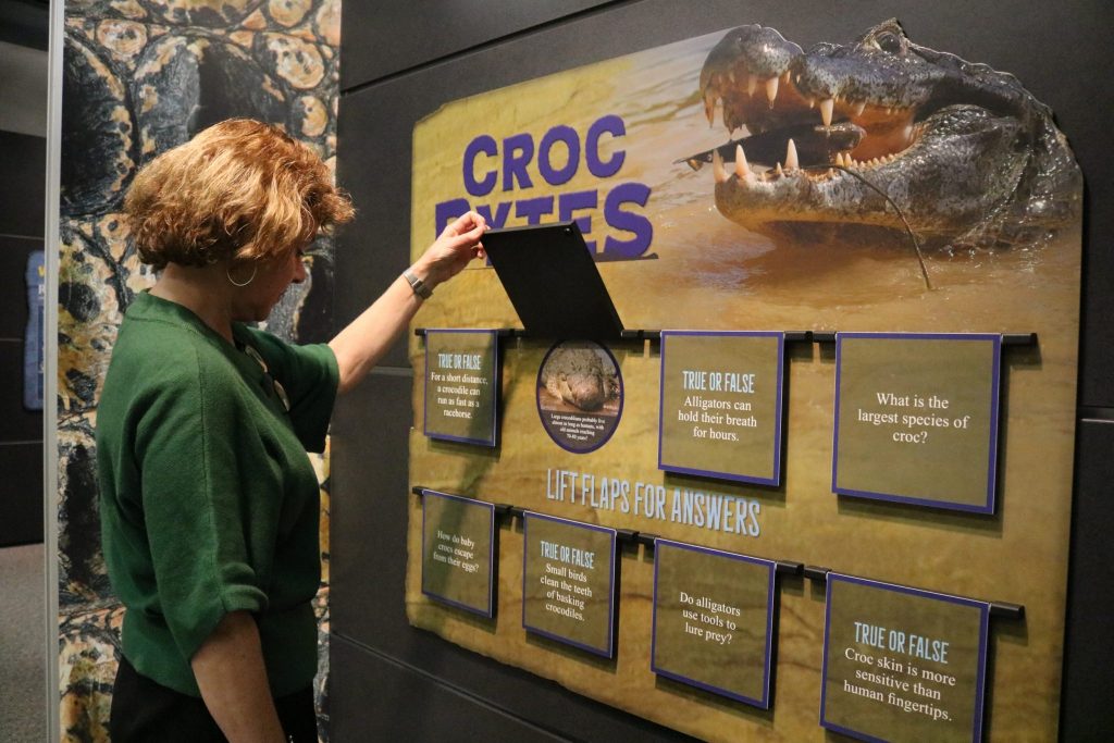 Informational panels quiz visitors on crocodilian facts and trivia in the “Crocs: Ancient Predators in a Modern World” exhibit, on display at the Florida Museum of Natural History in Gainesville May 18, 2019-Jan. 5, 2020. ©Photo courtesy of The Academy of Natural Sciences of Drexel University
