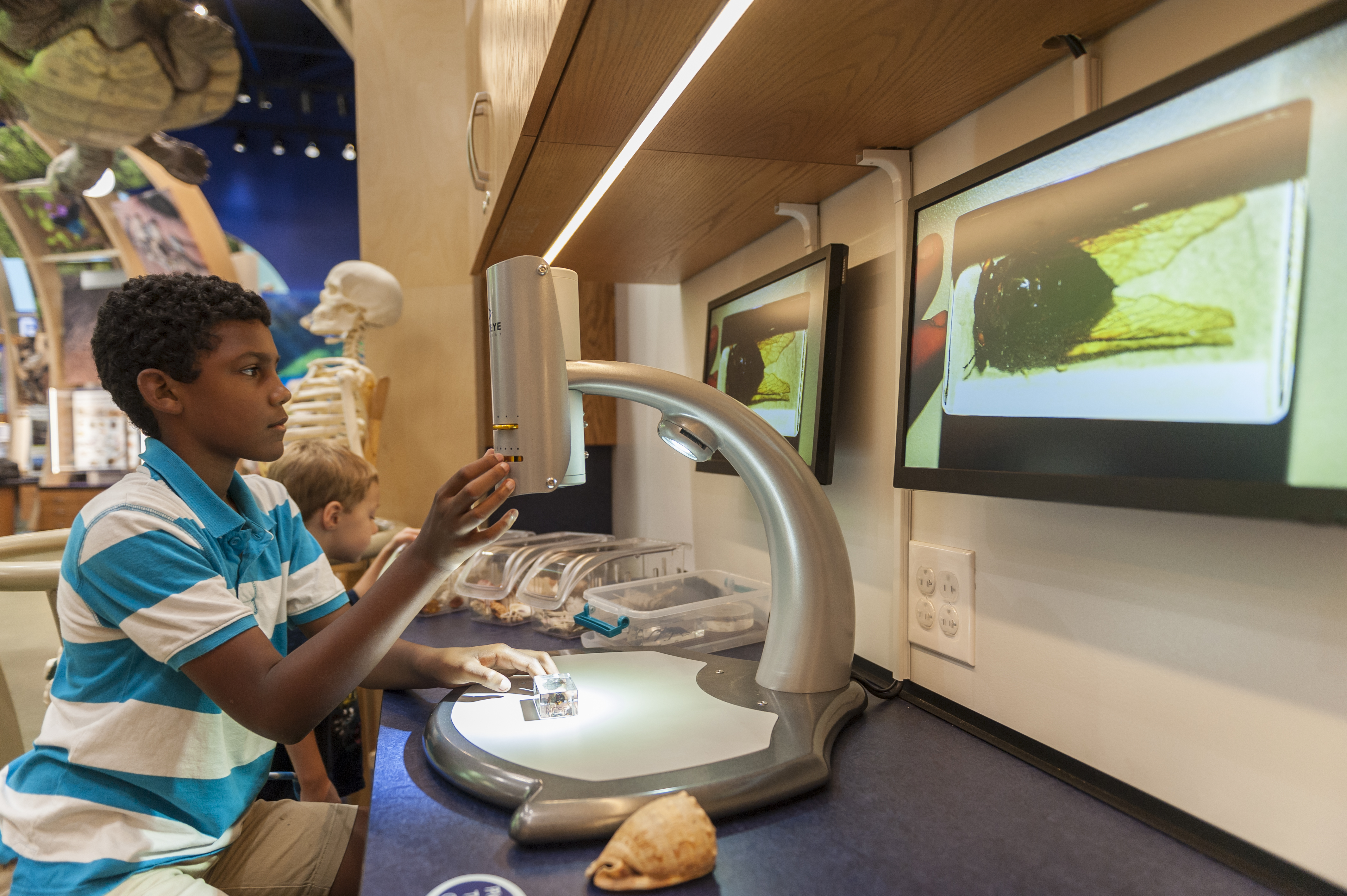 A child closely examines different species with a microscope in the “Discovery Zone” study area. ©Florida Museum photo by Kristen Grace