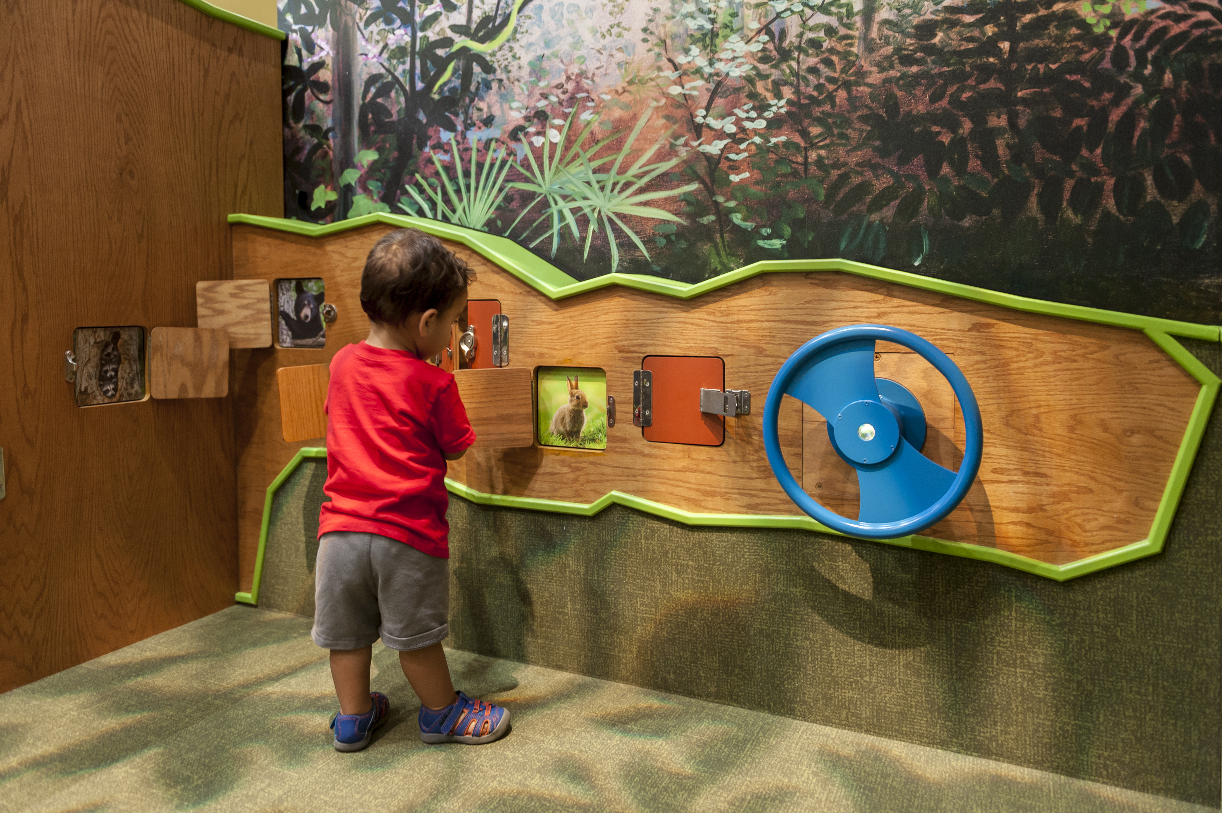 The exhibit includes a section for infants and toddlers to look for animals hidden in tree peepholes and a forest mural. ©Florida Museum photo by Kristen Grace