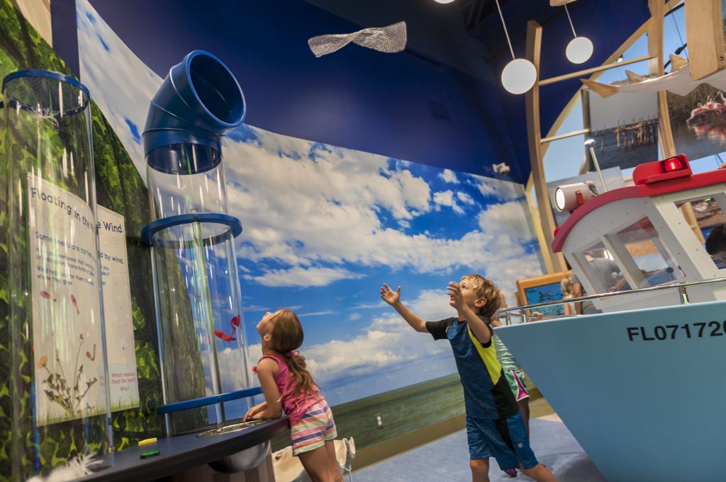 Children investigate how different objects float in the “Discovery Zone” wind tunnel. ©Florida Museum photo by Kristen Grace