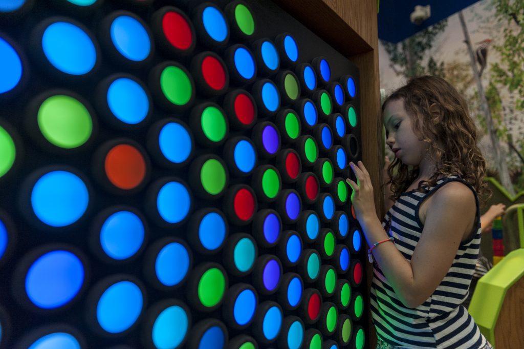 The “Discovery Zone” features a wall of multicolored lights for children to discover different figures, shapes and colors. ©Florida Museum photo by Kristen Grace