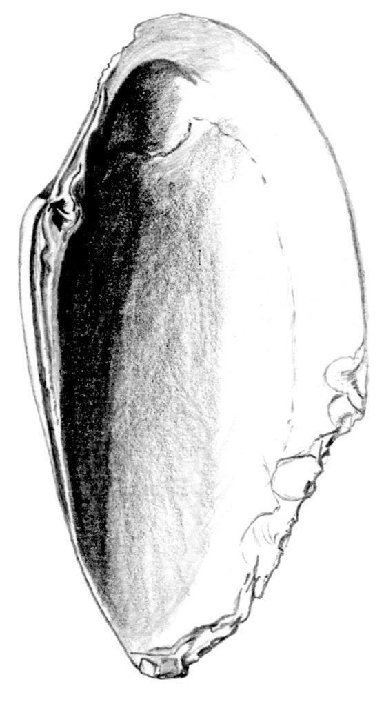 Archaeologists refer to the various layers as “strata” (singular “stratum”), and they are numbered from top to bottom. Stratum 1 is a variable gray sandy deposit with fragments of shell, rock, modern debris, roots, and other disturbances. Stratum 2 is a dense shell deposit with light gray sand, animal bone, charred wood fragments, pottery sherds, and shell artifacts. Based on field observations, the most abundant shell is that of the lightning whelk, followed by pearwhelk, true tulip, fighting conch, oyster, and crown conch. Also present are banded tulip, horse conch, quahog clam, bay scallop, ribbed mussel, and surf clam.