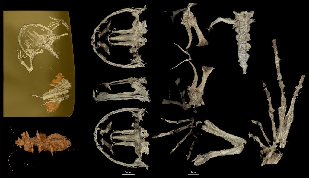 Less than an inch long, Electrorana is the most well-preserved of the group. Clearly visible in the amber are the frog’s skull, its forelimbs, part of its backbone, a partial hind limb and the unidentified beetle. The other amber fossils contain two hands and an imprint of a frog that likely decayed inside the resin.
