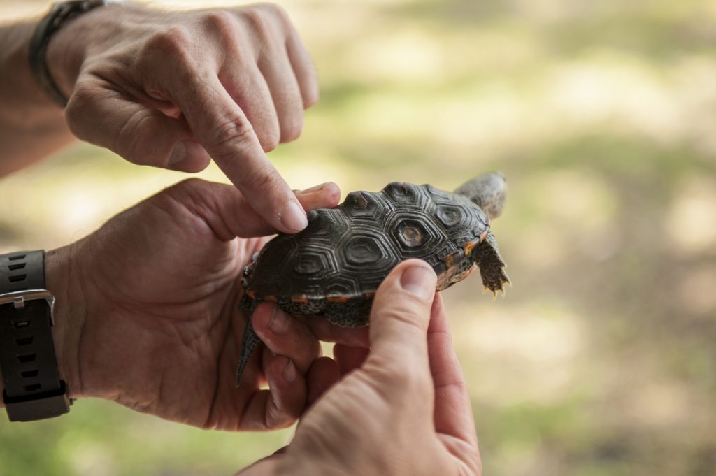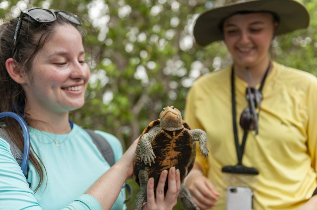 On the second morning of the course, the students helped Sheehy and his collaborator Ben Atkinson, an assistant professor at Flagler College, find and analyze a local population of diamondback terrapins, a unique species of turtle that needs brackish water to survive. Spotting one of these rare animals hiding in the wrack of a mangrove island can suddenly make scrambling around sharp-edged Spartina grass in the summer heat seem worth it.