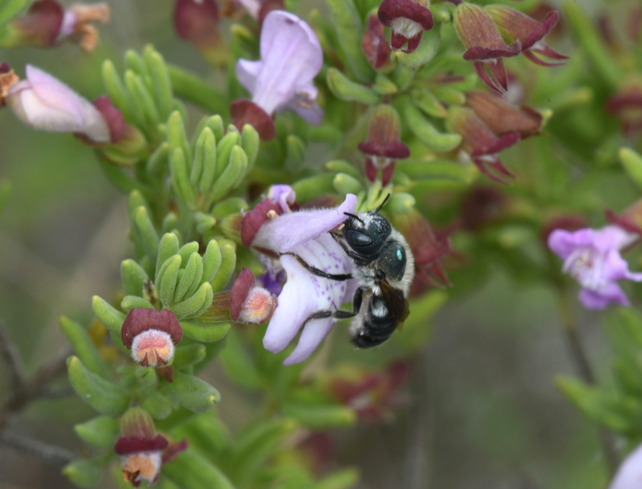 The bee’s common name comes from its main host plant Ashe’s calamint, Calamintha ashei, itself a threatened species in the state. False rosemary, Conradina brevifolia, is even rarer, listed as endangered at both state and federal levels. Researchers learned the blue calamintha bee visits false rosemary earlier in the year, before Ashe’s calamint is in bloom, leading to concerns about food availability if warming temperatures decouple the timing of the plant’s blossoming from the bee’s emergence in February.