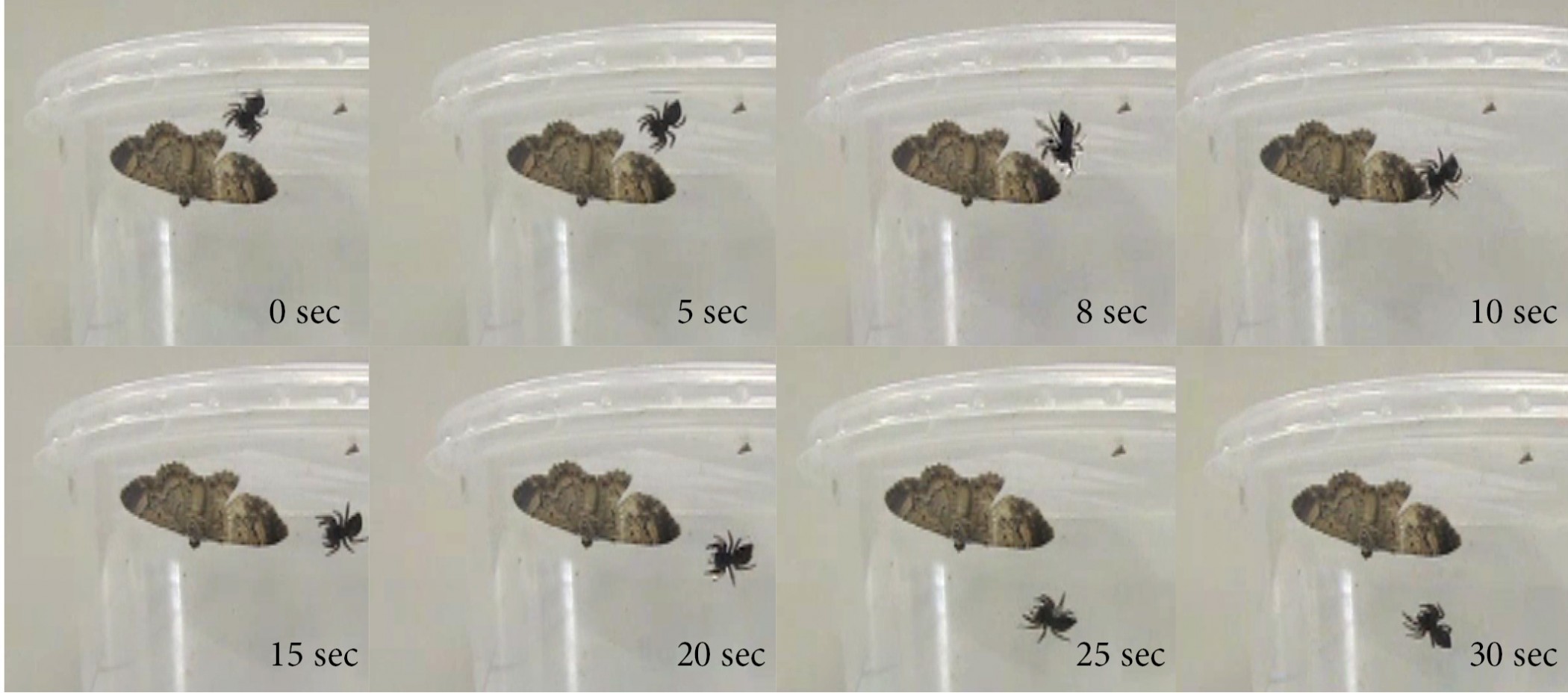 “From the video, you can see the spider is always very precise,” Sourakov said. “In a series of frames grabbed from the video, one can observe how the spider walks very carefully around a moth that looks like a leaf, identifies the head, and then attacks at the head region. The spider has an innate or acquired ability to distinguish the head region very well and it always attacks there to deliver its venom to the vital center to instantly paralyze the prey. Most importantly, the spider is very small, so sometimes its prey is 10 times larger.”