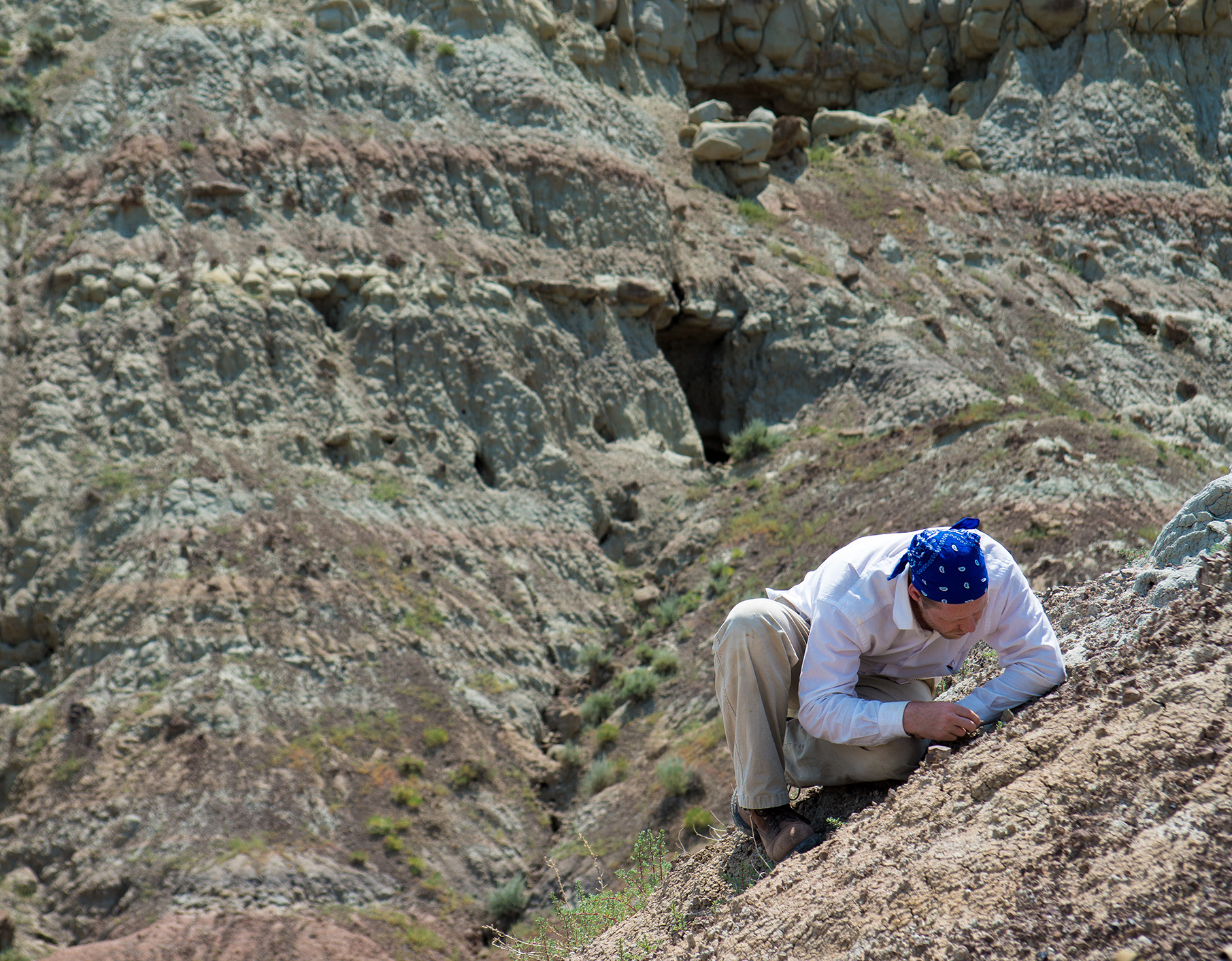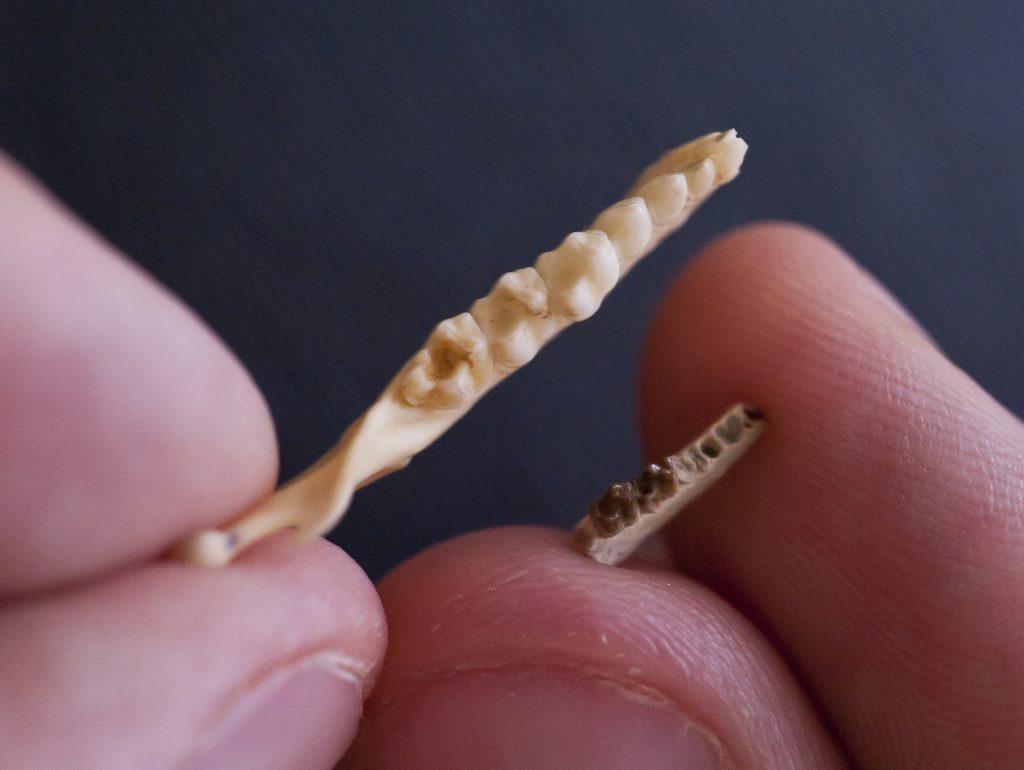 While Teilhardina bones are very rare in the fossil record, its teeth are more plentiful – if you know how to find them. Bloch’s team of paleontologists, Morse included, have spent years combing the surface of Wyoming’s Bighorn Basin on hands and knees and then packing out 50-pound bags of soil to a river to screen wash. The remaining bits of bones and teeth – which can be smaller than a flea – are examined under a microscope back at the museum.
