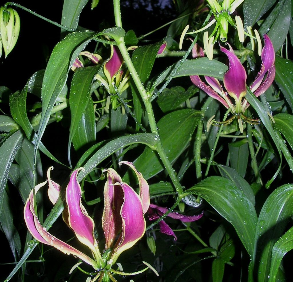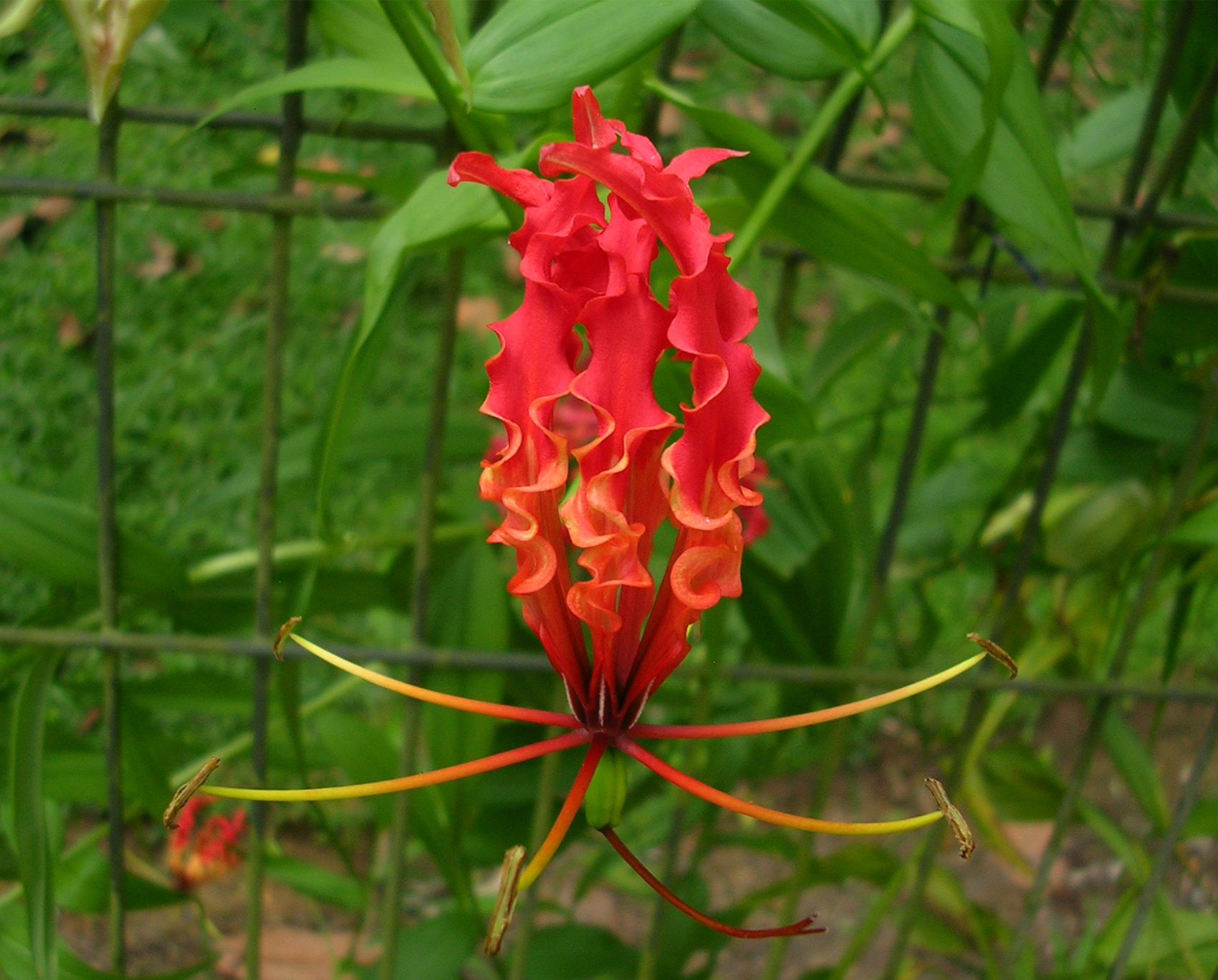 Gloriosa lily (Gloriosa superba), also known as flame lily or climbing lily, hails from Africa and Asia. It is a common flowering vine in Florida gardens and sometime escapes and establishes in the wild. Gloriosa lily climbs via tendrils at its leaf tips and has large, showy flowers that are usually bicolored yellow with red, orange or purple. All parts of the plant contain several toxic compounds, including the alkaloid colchicine. The toxins are highly concentrated in the rhizomes (tuberlike, underground stems). Most documented cases of poisoning from gloriosa lily are in humans rather than pets or livestock, and symptoms of colchicine poisoning typically occur two to six hours after ingestion. Be aware that many other types of garden lilies grown in Florida also contain various toxic alkaloids and can cause poisoning if consumed. These include amaryllis, daylilies, rain lilies, Easter lilies, blood lilies, hurricane lilies, crinum lilies and clivia lilies, also known as Natal lilies.