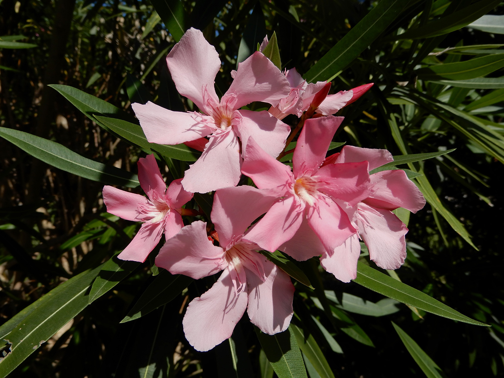 Oleander (Nerium oleander), also known as rose bay, is native to the Mediterranean region eastward to India and southern China. It is in the same family as frangipani and milkweed. Oleander is grown as a heat- and drought-tolerant evergreen flowering shrub in gardens throughout Florida. It has also escaped from cultivation and become established in the wild at scattered locations around the state. There are hundreds of cultivated varieties of oleander, which vary considerably in size and have single or double flowers in shades of pink, red or white (less often, yellow or orange). All parts of the oleander plant, including the milky latex produced by cut stems or leaves, contain a variety of cardiotoxic compounds that impact heart function. Many animal species are affected by the toxins, including humans, pets, livestock and some wildlife. In people, poisoning has been attributed to eating honey made from oleander flowers, inhaling smoke from burning branches, holding flowers or stems in the mouth, using cut branches to stir soup or roast meat over a fire and incorporating leaves or flowers in herbal teas.