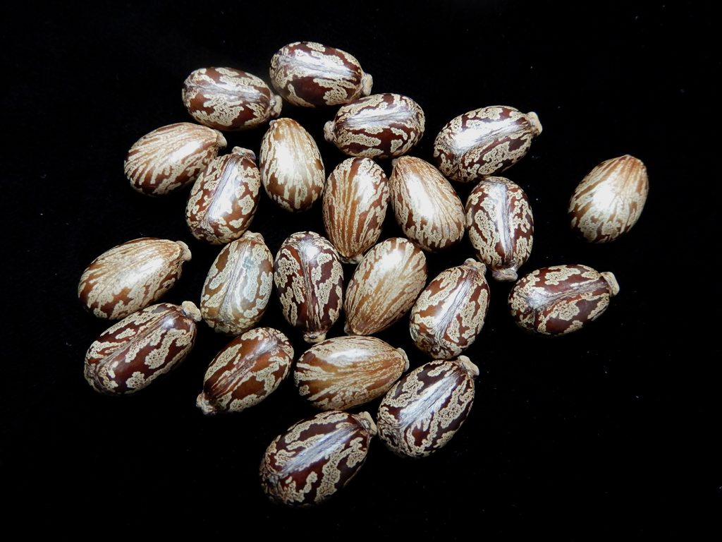 Castor bean (Ricinus communis), which is in the spurge and poinsettia family, is a large, robust non-woody plant from northern Africa. It is widely cultivated as an ornamental for its bold, tropical-looking foliage and interesting, spiny seed capsules. Castor bean is also grown commercially as a source of seed oil used in cosmetics, paints, plastics and lubricants. In Florida, castor bean has escaped from cultivation and become established throughout the state, particularly in frost-free areas. The toxic compound in castor bean, ricin, is structurally similar to abrin in rosary pea. It is also most concentrated in the seeds, which are tan with darker brown marbling. Ricin is poorly absorbed by the digestive systems of ruminant livestock, such as cattle or goats, but poses a greater risk to humans and pets. Castor oil, which was once popular as a cure-all and laxative, is heat treated and refined to remove any toxic ricin.