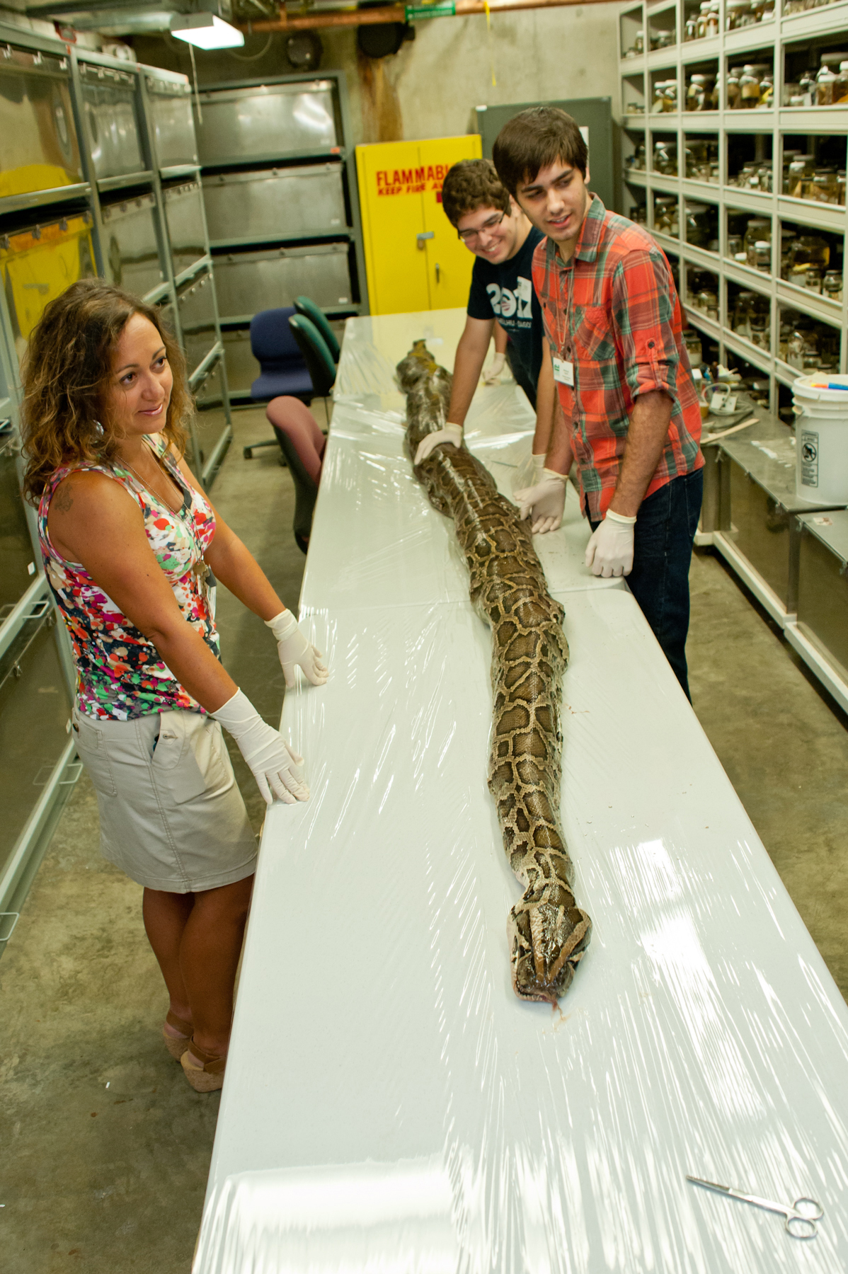 Scientists at the Florida Museum of Natural History on the University of Florida campus examined the internal anatomy of the 164.5-pound snake Friday. The animal was brought to the Florida Museum from Everglades National Park as part of a long-term project with the U.S. Department of the Interior to research methods for managing the state’s invasive Burmese python problem. Following scientific investigation, the snake will be mounted for exhibition at the museum for about five years, and then returned for exhibition at Everglades National Park.